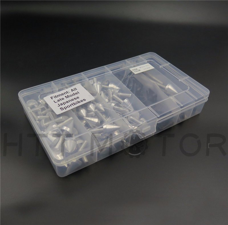 Motorcycle Designed by reviewing the needs of mechanics and riders at the dealership and at the racetrack, this kit has over 100 pieces of premium factory style metric hardware including socket head bolts, button head bolts, flange bolts, nylon removable rivets, Fuji-lock nuts, fairing bolts with nylon washers, windscreen fasteners and more.. Style: Spike Style Japanese Sportbike Track Pack Universal Hardware Kit. Bolt MC hardware meets or exceeds OEM specs.. Fits all model Japanese sportbikes including Honda, Yamaha, Kawasaki, and Suzuki.Other fine products