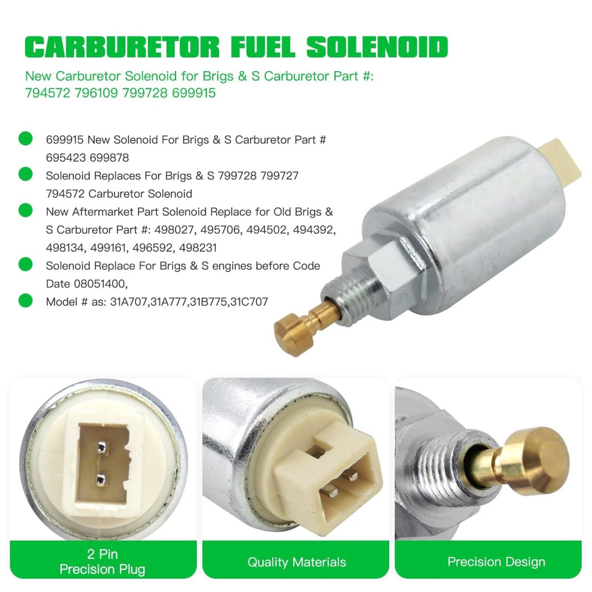 Condition: and all parts are tested and quality controlled prior to shipment. Compatibility: For Craftsman; For John Deere Lawn Mower Tractors; For Bri-ggs&Stratton; For Generators Etc Outdoor machines; Fits Models: 498027, 495706, 494502, 494392, 498134, 499161, 496592, 498231 695423 699878 799728 799727 794572. Replace Part Number: for 499161 496592 498231 695423 699915 699916 699878 794572 796109 799728 794572, 31A707, 31A777, 31B775, 31C707. Package includes: 1x Carburetor Fuel Solenoid Valve Replacement as pictured. Brand Store - BLUE ELF, if you had any concern about this product - BEF006757-2-c, YOU CAN REACH OUT TO US FOR A SATISFACTORY EXPERIENCE.Other fine products