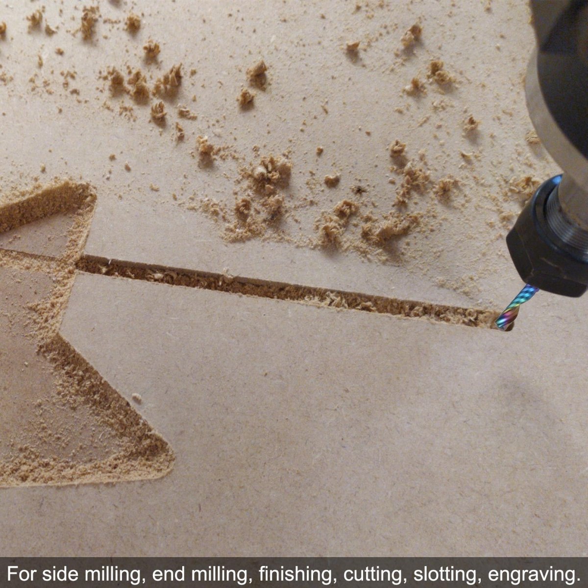 Spiral Router Bit Size: Upcut spiral router bit with 1/4" cutting diameter, 1/4" shank, 1" cutting length, 2-1/2" total length, upcut (right hand) cut type, 1 flute. Large spiral flute design helps effectively remove chips during cutting, reducing clogging and improving chip evacuation.. Wide Applications: CNC router bits are suitable for side milling, end milling, finish machining, cutting, slotting, engraving etc. Can be used on a variety of materials such as wood, MDF, laminate, plywood, plastic, soft metals (aluminum, brass and copper.), zinc.. Up-Cut Spiral Flutes: Lift chips upward and away from the cutting area, providing excellent chip evacuation. Upward cutting action also produces a clean, smooth surface finish by minimizing tearing, great for woodworking or materials that tear easily.. Solid Carbide: Milling bit offers high hardness, excellent wear resistance, excellent heat resistance, and durability. Can produce clean and precise cuts. Titanium aluminum carbon coating increases hardness and wear resistance, provides excellent heat resistance, corrosion resistance, and reduces friction and cutting forces for longer tool life and improved durability.. Tips: Used with standard milling machines (CNC and plunge routers), CNC machining centers or engraving machines. Universal chamfered round shank, good compatibility. Use a suitable coolant or lubrication, and make sure the end mill is suitable for the specific application and material being processed..Other fine products