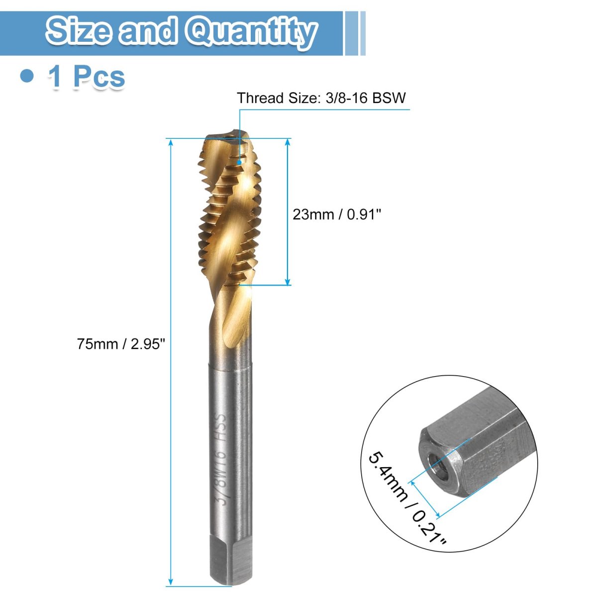 Spiral Flute Tap: Thread size: 3/8-16 BSW; thread length: 23mm / 0.91", overall length: 75mm / 2.95", square end size: 5.4mm / 0.21". H2 tolerance, right-hand thread cutting, with clean threads and sharp-cut cutting edges for fast and accurate tapping.. Notable Features: Spiral flute design ensures smooth chip evacuation, prevents breakage, and enables more efficient tapping. The spiral tip of the tap helps guide it into the hole, reducing the torque required to turn it, and the flutes easily remove chips and debris from the hole and machine.. Wide Applications: Spiral flute thread taps are suitable for machining blind or deep holes and sticky materials, and can be used for tapping stainless steel, aluminum, cast iron, alloy steel, ordinary steel, non-ferrous metals, hard plastics, etc. Suitable for drilling machines, tapping machines, CNC machine tools and milling machines. Used with tapping oil, you can get more precise threads and more durable taps.. Strong & Durable: Taps are made of M2 high-speed steel (HSS6542), It has high hardness, toughness and good wear resistance, good cutting performance, and can produce clean and precise holes. Titanium coating has excellent corrosion resistance, which prevents corrosion and reduces friction, making tapping smoother.. Warm Tip: It is recommended to use machine taps with tap chucks with overload protection. It is not recommended for manual use and electric drill tapping to avoid damage caused by uneven force. The tapping angle should be 90 degrees vertical. The harder the material, the slower the drilling speed..Other fine products