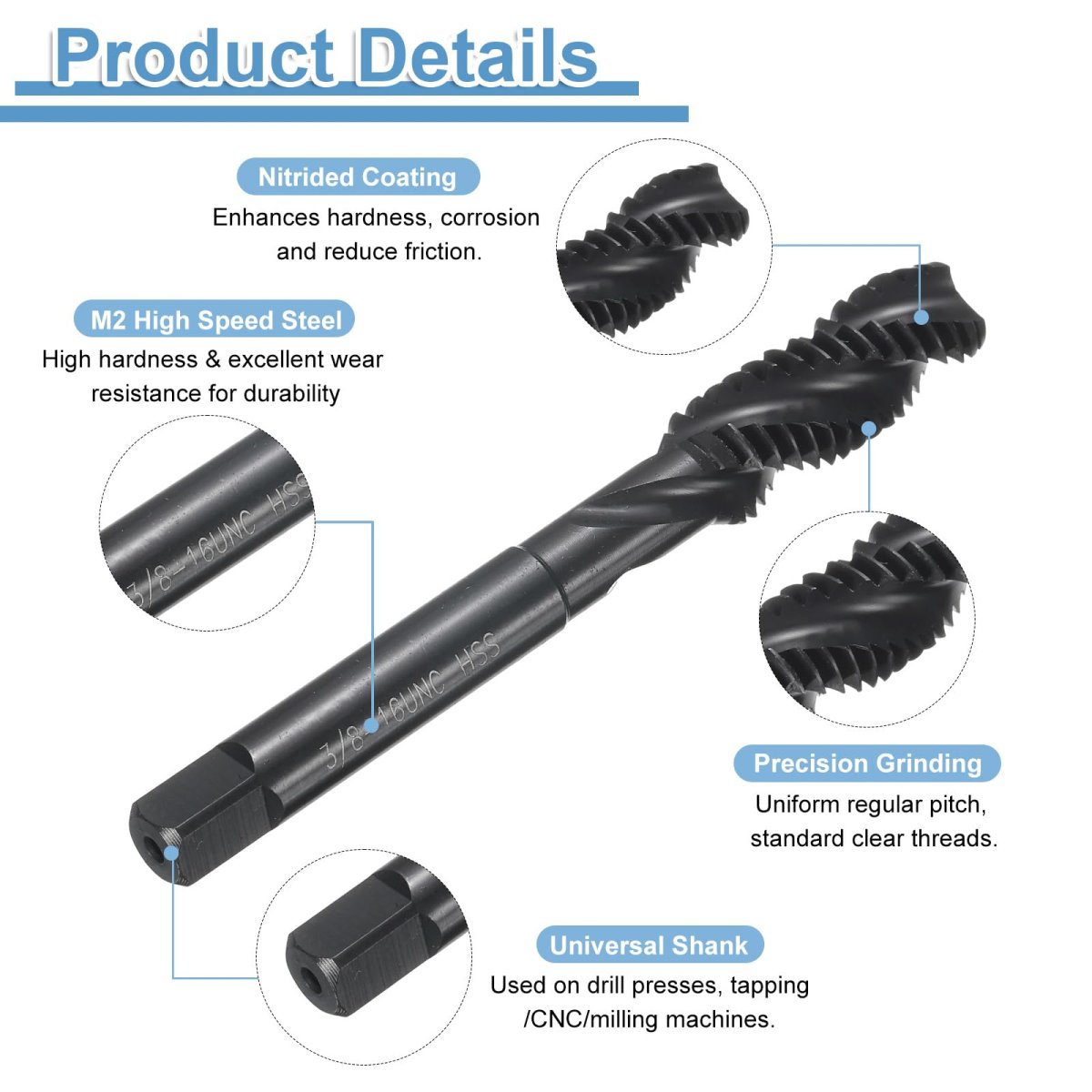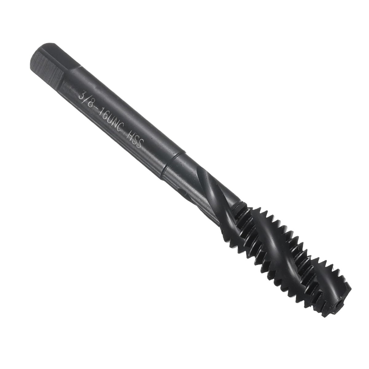 Spiral Flute Tap: Thread size: 3/8-16 UNC; thread length: 26mm / 1.02", overall length: 75mm / 2.95", square end size: 5.5mm / 0.22". H2 tolerance, right-hand thread cutting, with clean threads and sharp-cut cutting edges for fast and accurate tapping.. Notable Features: Spiral flute design ensures smooth chip evacuation, prevents breakage, and enables more efficient tapping. The spiral tip of the tap helps guide it into the hole, reducing the torque required to turn it, and the flutes easily remove chips and debris from the hole and machine.. Wide Applications: Spiral flute thread taps are suitable for machining blind or deep holes and sticky materials, and can be used for tapping stainless steel, aluminum, cast iron, alloy steel, ordinary steel, non-ferrous metals, hard plastics, etc. Suitable for drilling machines, tapping machines, CNC machine tools and milling machines. Used with tapping oil, you can get more precise threads and more durable taps.. Strong & Durable: Taps are made of M2 high-speed steel (HSS6542), It has high hardness, toughness and good wear resistance, good cutting performance, and can produce clean and precise holes. Nitrided surface can improve corrosion resistance and hardness, reduce friction, and extend service life, making it very suitable for a wide range of applications.. Warm Tip: It is recommended to use machine taps with tap chucks with overload protection. It is not recommended for manual use and electric drill tapping to avoid damage caused by uneven force. The tapping angle should be 90 degrees vertical. The harder the material, the slower the drilling speed..Other fine products