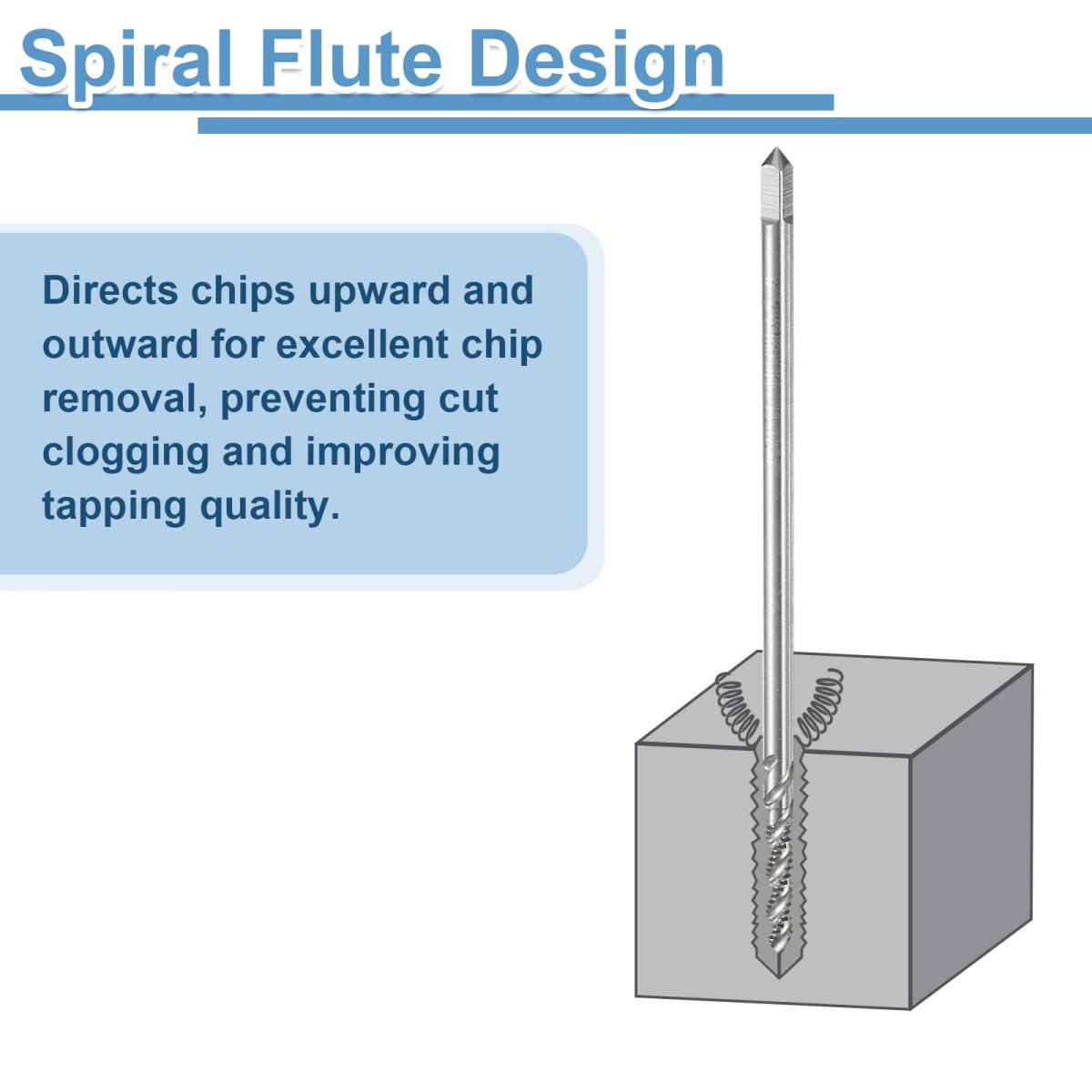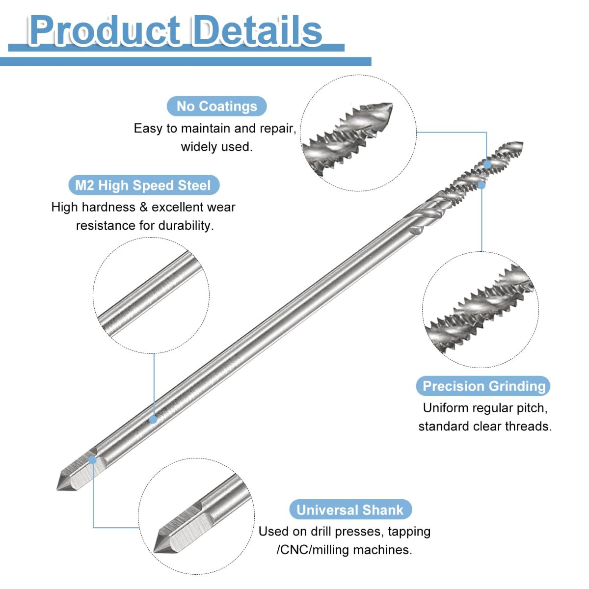 Spiral Flute Tap: Thread size: 6-32 UNC; thread length: 18mm / 0.71", overall length: 100mm / 3.94", square shank side width: 3mm / 0.12". 2B tolerance, right-hand thread cutting, with clean threads and sharp-cut cutting edges for fast and accurate tapping.. Notable Features: Spiral flute design prevents breakage, and enables more efficient tapping. The spiral tip of the tap helps guide it into the hole, reducing the torque required to turn it, and the flutes easily remove extra from the hole and machine.. Wide Applications: Spiral flute thread taps are suitable for machining blind or deep holes and sticky materials, and can be used for tapping stainless steel, aluminum, cast iron, alloy steel, ordinary steel, non-ferrous metals, hard plastics, etc. Suitable for drilling machines, tapping machines, CNC machine tools and milling machines. Used with tapping oil, you can get more precise threads and more durable taps.. Strong & Durable: The taps are made of M2 high-speed steel (HSS6542) and run at high speeds to quickly and efficiently process threads. It has high hardness, toughness and good wear resistance, good cutting performance, and can produce clean and precise holes. Uncoated tap is easy to maintain and repair, and great for a wide range of applications.. Warm Tip: It is recommended to use machine taps with tap chucks with overload protection. It is not recommended for manual use and electric drill tapping to avoid damage caused by uneven force. The tapping angle should be 90 degrees vertical. The harder the material, the slower the drilling speed..