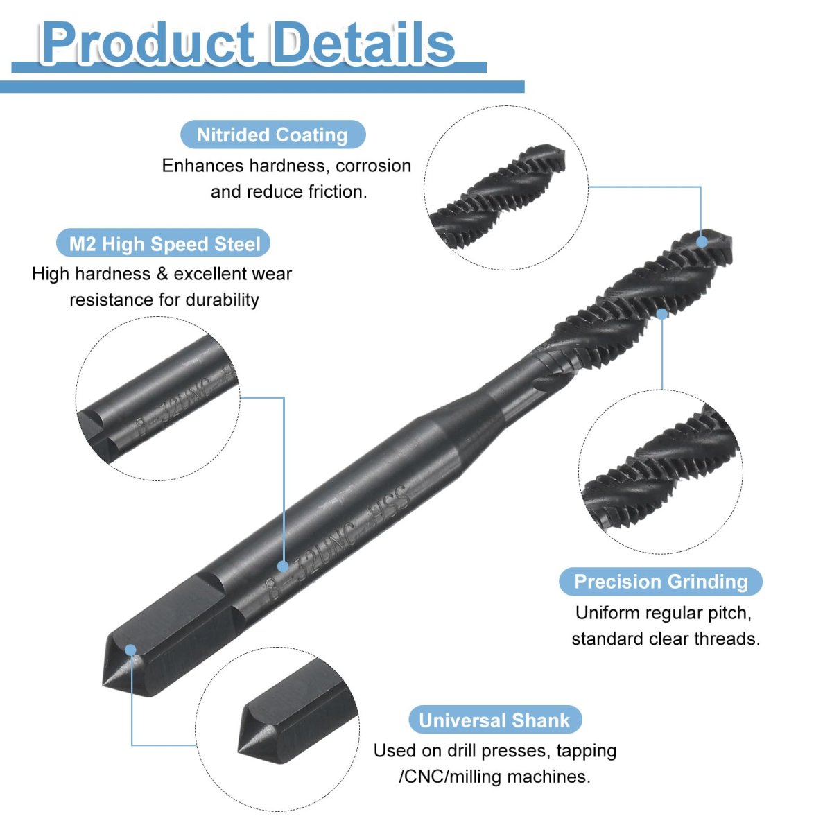 Spiral Flute Tap: Thread size: 8-32 UNC; thread length: 16mm / 0.63", overall length: 57mm / 2.24", square end size: 4mm / 0.16". H2 tolerance, right-hand thread cutting, with clean threads and sharp-cut cutting edges for fast and accurate tapping.. Notable Features: Spiral flute design ensures smooth chip evacuation, prevents breakage, and enables more efficient tapping. The spiral tip of the tap helps guide it into the hole, reducing the torque required to turn it, and the flutes easily remove chips and debris from the hole and machine.. Wide Applications: Spiral flute thread taps are suitable for machining blind or deep holes and sticky materials, and can be used for tapping stainless steel, aluminum, cast iron, alloy steel, ordinary steel, non-ferrous metals, hard plastics, etc. Suitable for drilling machines, tapping machines, CNC machine tools and milling machines. Used with tapping oil, you can get more precise threads and more durable taps.. Strong & Durable: Taps are made of M2 high-speed steel (HSS6542), It has high hardness, toughness and good wear resistance, good cutting performance, and can produce clean and precise holes. Nitrided surface can improve corrosion resistance and hardness, reduce friction, and extend service life, making it very suitable for a wide range of applications.. Warm Tip: It is recommended to use machine taps with tap chucks with overload protection. It is not recommended for manual use and electric drill tapping to avoid damage caused by uneven force. The tapping angle should be 90 degrees vertical. The harder the material, the slower the drilling speed..Other fine products