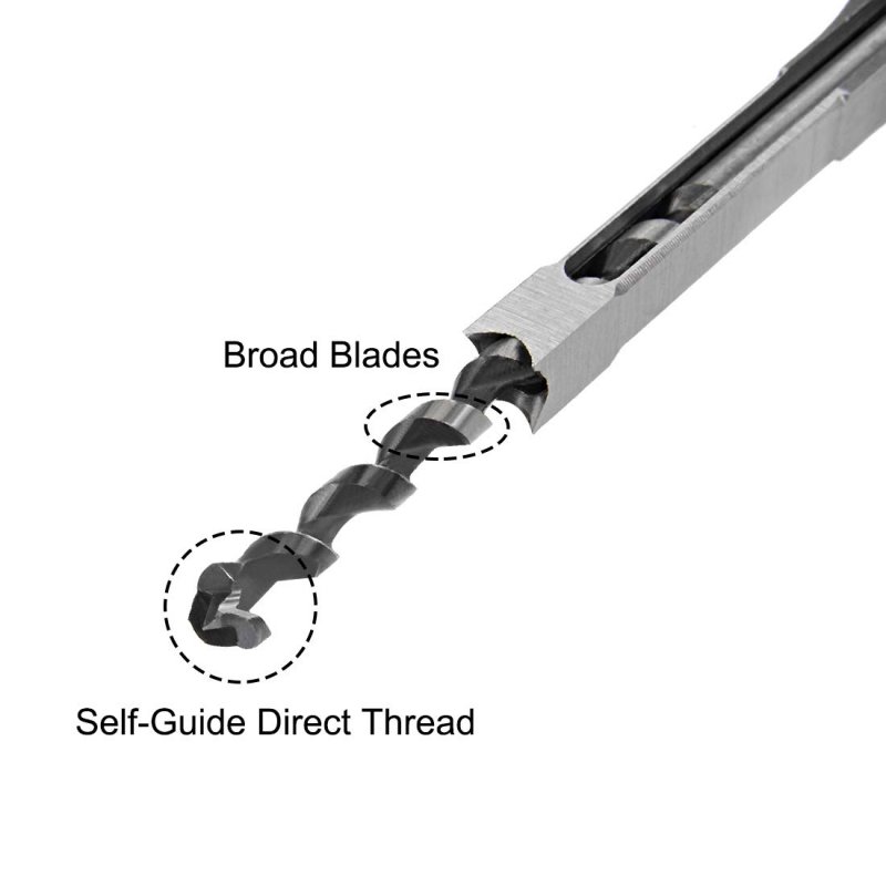 SIZE5/16" square chisel width, 52mm cutting depth, 210mm total length.. TIP AND EDGEThe best-designed drilling point tip and 4 cutting corners enable fast drilling with small opening resistance, and penetrating into working pieces of wood in precise opening size very smoothly and fast.. MATERIALMade of High-carbon steel, through heat processing, with high hardness (48-50 HRC) drill bits, and sharp-edged square chisel, long life.. ADVANTAGEWith long drill core and square chisel, easy to lock the hole on the wood, can reduce labor intensity of construction workers, speed up the construction speed, reduce construction costs.. OPERATIONUsed with mortise and tenon machine with double effect, and electric drill, hammer and other tools is required for punching square hole in wood..Other fine products