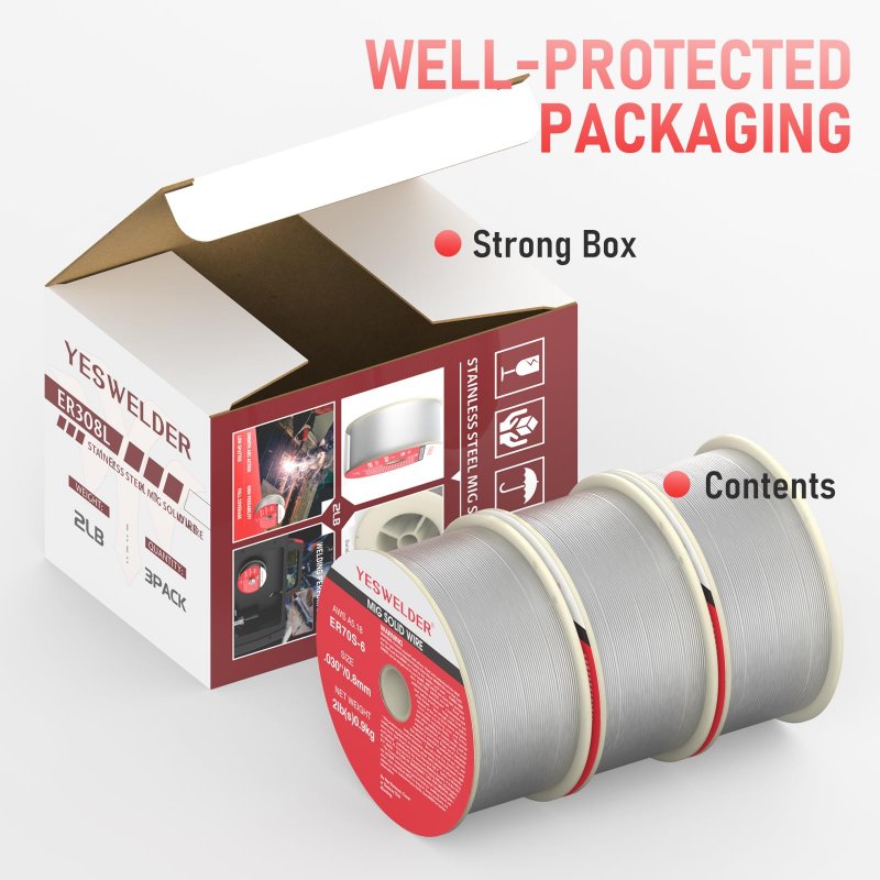 [ER308L] ER308L stainless steel MIG welding process for 304, 304L, 308, 308L, 321 and 347 stainless steels.. [SHIELDING GAS] Use 100% Argon or Argon/Helium for greater penetration and higher speeds.. [MULTIPLE USAGE] Widely used in the welding of pressure vessels, food machinery and restauraunt equipment, medical equipment, fertilizer equipment, textile machinery, etc.. [EXCELLENT PERFORMANCE] It has smooth wire feeding, stable arc, beautiful shape as well as little spatter. It can be welded in all positions, and contains a proper amount of ferrite, has good crack and corrosion resistance.. [SPECIFICATION] Diameter: .030''/Weight: 2 pounds/Quantity: 3 packs(more beneficial combo price)..Other fine products