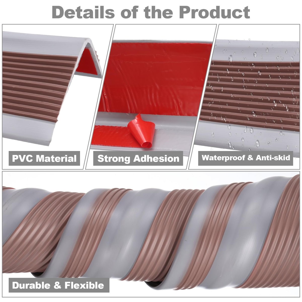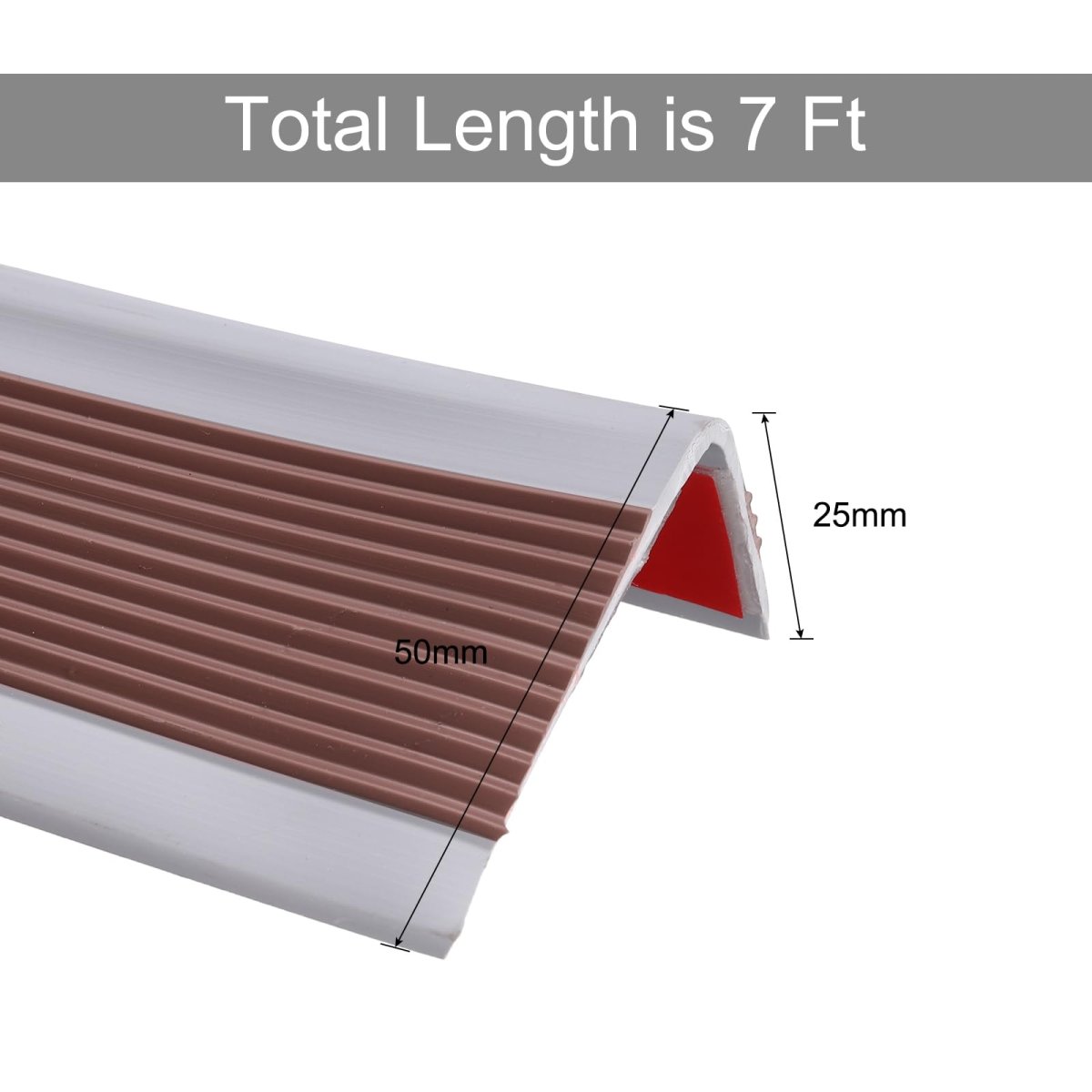You Will Get: 7 ft brown stair edge protector, suitable for both indoor and outdoor use. It's a good choice for your safety.. Durable Material: The Stair Edge Protector is made of PVC, which provides excellent traction, is soft and anti-collision, waterproof and non-slip, wear-resistant, and long-lasting, reducing the risk of slipping and falling.. Strong Adhesion: Our non-slip stair edge trim strips are made with a powerful adhesive that ensures a secure and long-lasting bond.. Easy to Install: Clean and dry the installation area. Measure the length of your stairs and cut the tread to size. Remove the adhesive film and adhere to the surface. Press firmly to ensure optimum adhesion.. High Applicability: This rubber stair nosing can be applied to stairs made of many materials, such as tile, wood, marble, steel or iron, metal, or glass..Other fine products