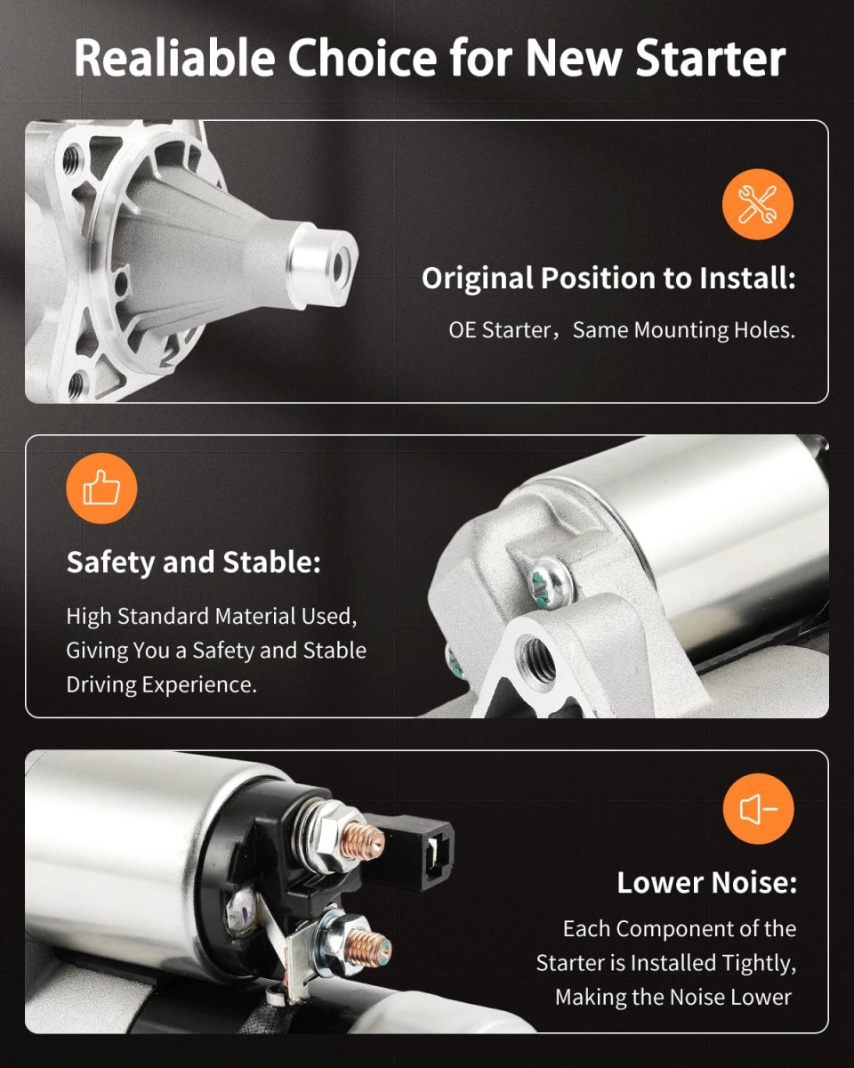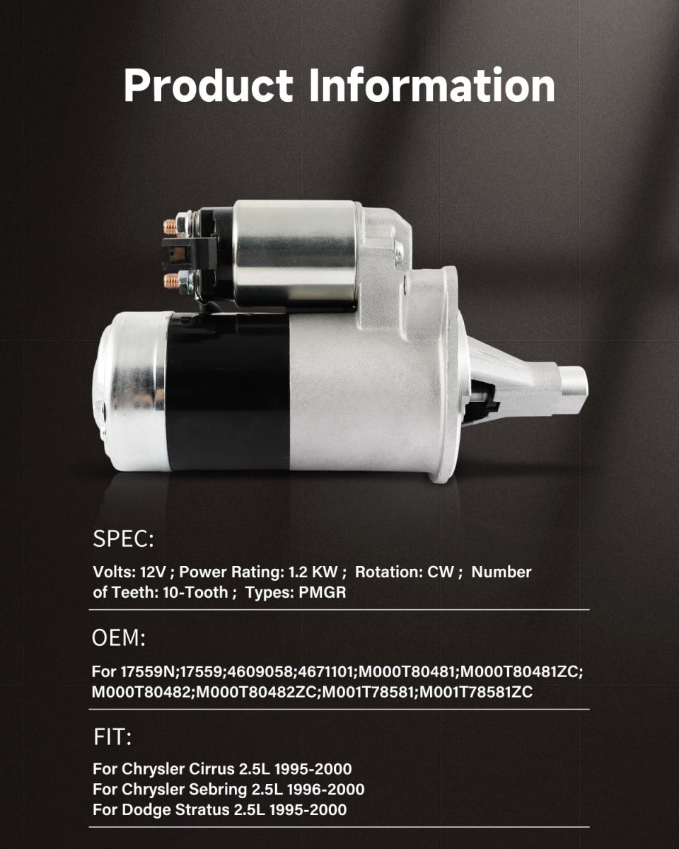 FIT FOR : Starter For 1995-2000 for Chrysler Cirrus 2.5L,1996-2000 for Chrysler Sebring 2.5L,1995-2000 for Dodge Stratus 2.5L. REFERENCE NUMBER : 17559N;17559;4609058;4671101;M000T80481;M000T80481ZC;M000T80482;M000T80482ZC;M001T78581;M001T78581ZC. SPECIFICATION : Volts: 12V ; Power Rating: 1.2 KW ; Rotation: CW ; Number of Teeth: 10-Tooth ; Types: PMGR ;. FEATURES :Designed to withstand the harshest Situations/Provides balanced high speed torque for maximum performance and dependability/Armature/commutator remachined to the toughest concentricity standards in the industry/Increases brush life and maximizes starting power/Solenoids include high temp caps,copper windings and terminal hardware/Less battery draw results in faster starts with maximum voltage.. EASY INSTALLED: OE quality Direct replacement/Installs the same as factory unit/Same dimensions as OE part/Same gauge material as OE/Installation requires no modifications..Other fine products