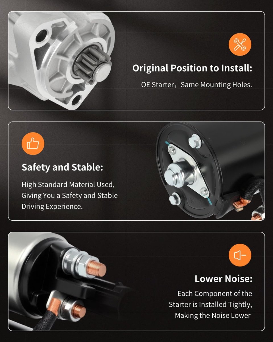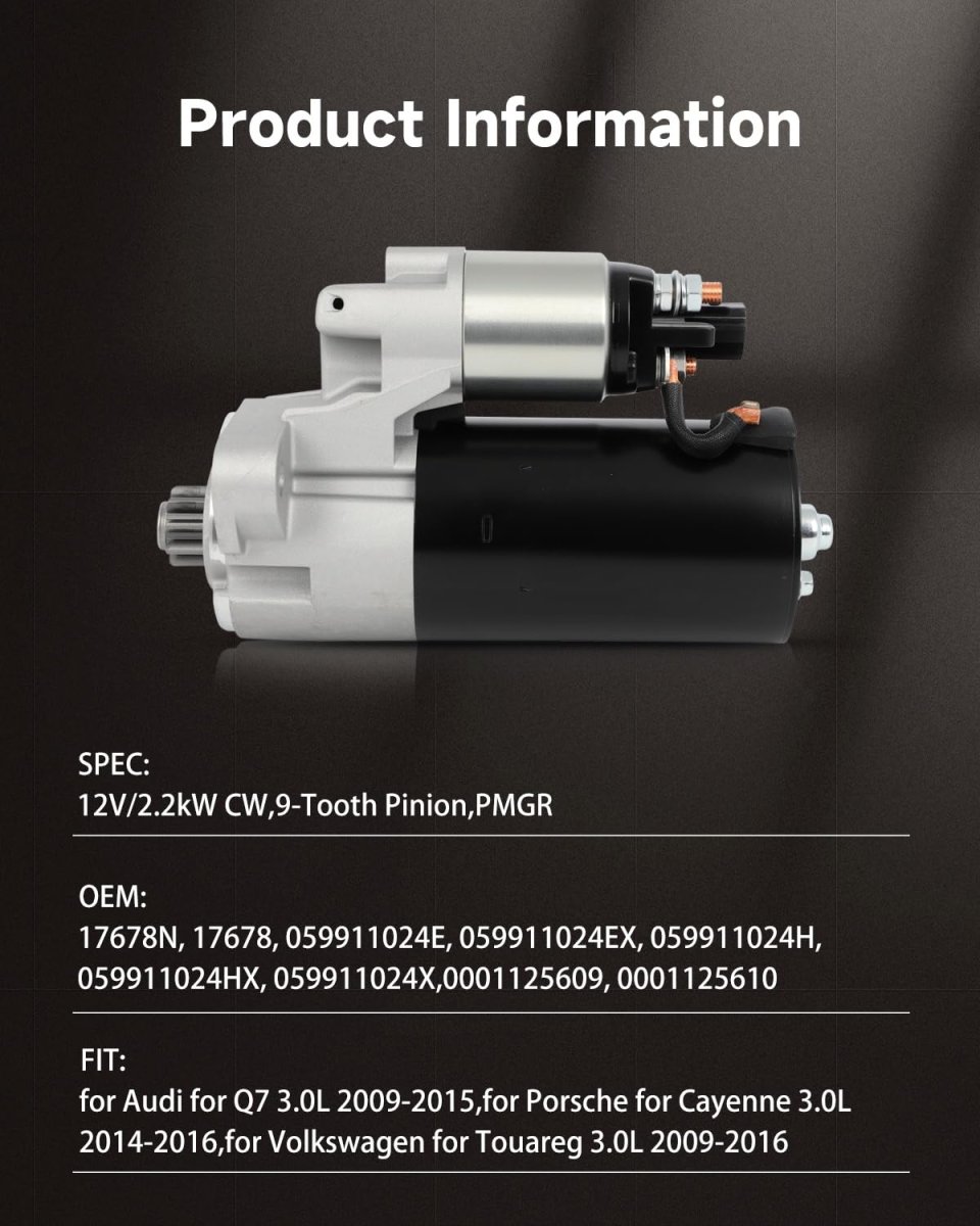 FIT FOR : Starter for Audi for Q7 3.0L 2009-2015,for Porsche for Cayenne 3.0L 2014-2016,for Volkswagen for Touareg 3.0L 2009-2016. REFERENCE NUMBER : 17678N, 17678, 059911024E, 059911024EX, 059911024H, 059911024HX, 059911024X,0001125609, 0001125610, 95560410800, 955604108X. SPECIFICATION : Volts: 12V ; Power Rating: 2.2kW ; Rotation: CW ; Number of Teeth: 9-Tooth Pinion ; Types: PMGR ;. FEATURES :Designed to withstand the harshest Situations/Provides balanced high speed torque for maximum performance and dependability/Armature/commutator remachined to the toughest concentricity standards in the industry/Increases brush life and maximizes starting power/Solenoids include high temp caps,copper windings and terminal hardware/Less battery draw results in faster starts with maximum voltage.. EASY INSTALLED: OE quality Direct replacement/Installs the same as factory unit/Same dimensions as OE part/Same gauge material as OE/Installation requires no modifications..Other fine products