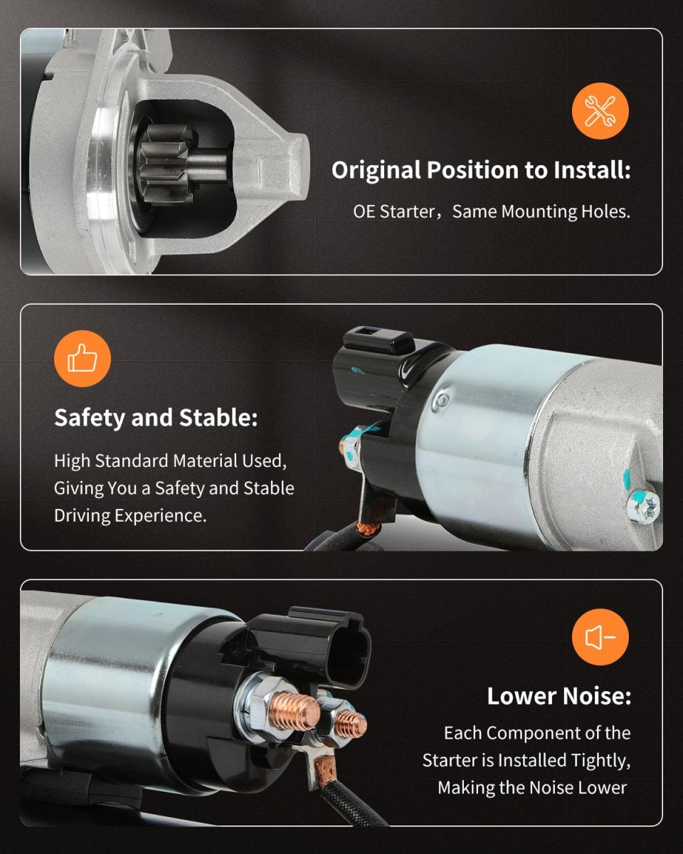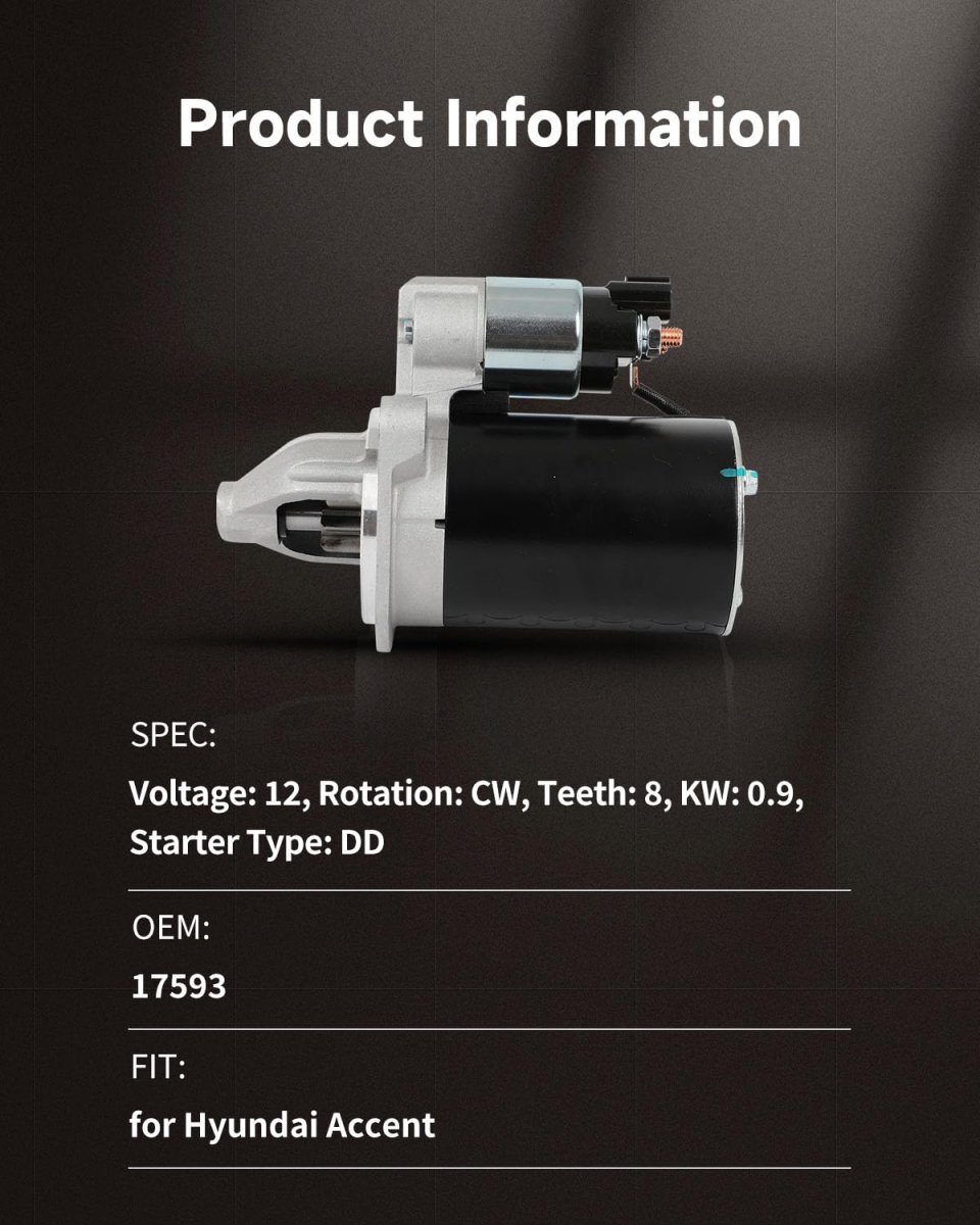 FIT FOR : Starter for Hyundai for Accent 1.6L 2012-2013,for Hyundai for Veloster 1.6L 2012-2013,for Kia for Rio 1.6L 2012 ,for Kia for Soul 1.6L 2010-2012. REFERENCE NUMBER : 36100-2B100 36100-2B100, 36100-2B100RU 1195239 17593 108-570 SVA0023 17593 17593S 17546 410-40049 17593 244-8614 91-20-3563. SPECIFICATION : Volts: 12V ; Power Rating: 0.9kW ; Rotation: CW ; Number of Teeth: 8-Tooth Pinion ; Types: DD ;. FEATURES :Designed to withstand the harshest Situations/Provides balanced high speed torque for maximum performance and dependability/Armature/commutator remachined to the toughest concentricity standards in the industry/Increases brush life and maximizes starting power/Solenoids include high temp caps,copper windings and terminal hardware/Less battery draw results in faster starts with maximum voltage.. EASY INSTALLED: OE quality Direct replacement/Installs the same as factory unit/Same dimensions as OE part/Same gauge material as OE/Installation requires no modifications..Other fine products
