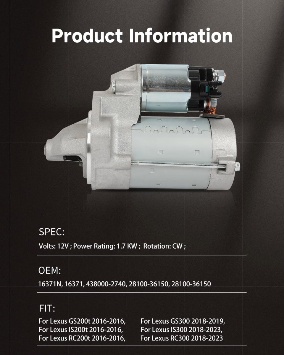 FIT FOR : Starter For Lexus GS200t 2016-2016,For Lexus GS300 2018-2019,For Lexus IS200t 2016-2016,For Lexus IS300 2018-2023,For Lexus RC200t 2016-2016,For Lexus RC300 2018-2023. REFERENCE NUMBER : 16371N, 16371, 438000-2740, 28100-36150, 28100-36150. SPECIFICATION : Volts: 12V ; Power Rating: 1.7 KW ; Rotation: CW ; Number of Teeth: ;. FEATURES :Designed to withstand the harshest Situations/Provides balanced high speed torque for maximum performance and dependability/Armature/commutator remachined to the toughest concentricity standards in the industry/Increases brush life and maximizes starting power/Solenoids include high temp caps,copper windings and terminal hardware/Less battery draw results in faster starts with maximum voltage.. EASY INSTALLED: OE quality Direct replacement/Installs the same as factory unit/Same dimensions as OE part/Same gauge material as OE/Installation requires no modifications..Other fine products