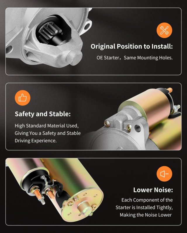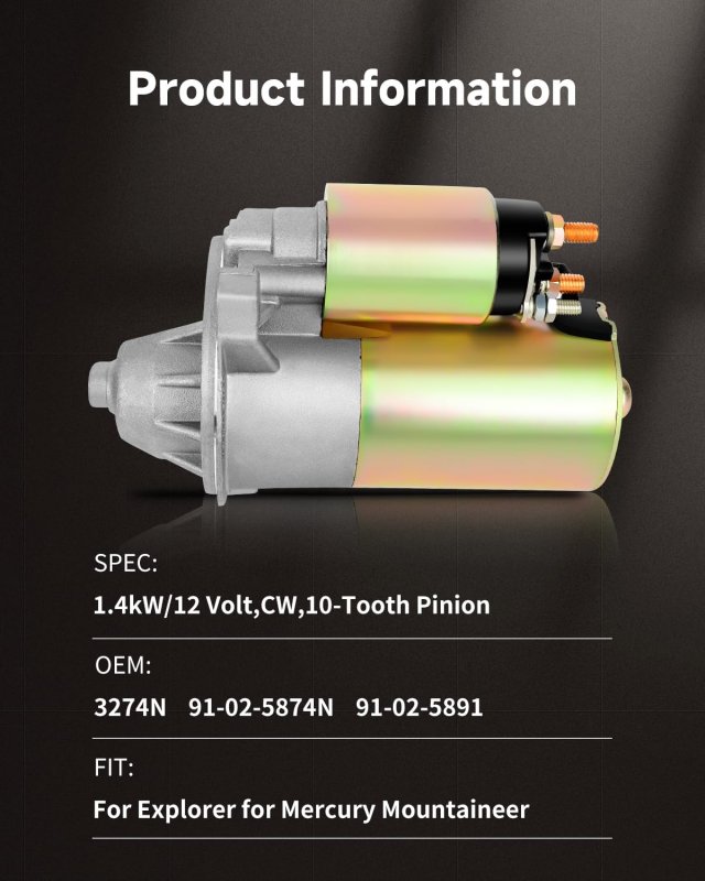 FIT FOR - Starter for 1996 1997 1998 1999 2000 2001 for Ford Explorer 1997 1998 1999 2000 2001 for Mercury Mountaineer. SPECIFICATION - 1.4kW/12 Volt, CW, 10-Tooth Pinionfor Ford PMGR PMGR100% NewOE performance torque & outputSolenoids feature late style S-terminal with threaded post & include a spade terminal conversion kitAll component parts are OE interchangeableStarter, drive & solenoid are endurance tinspectedReplaces - for Ford F67U-11000-AA, F67Z-11002-AA, F67Z-11002-AARM, F87U-11000-CA, F87U-11000-CB, F87Z-11002-CA, F87Z-11002-CARM. FEATURES - Designed to withstand the harshest Situations/Provides balanced high speed torque for maximum performance and dependability/Armature/commutator remachined to the toughest concentricity standards in the industry/Increases brush life and maximizes starting power/Solenoids include 100% new high temp caps,contacts,copper windings and terminal hardware/Less battery draw results in faster starts with maximum voltage.. 100% INSPECTION meets or exceeds OE manufacturers' torque,amperage draw and RPM standards.The 100% full-load inspection to ensures that buyers can use starters with the same quality as the OE manufacturer.. EASY INSTALLED - OE quality ,Installs the same as factory unit/Same dimensions as OE part/Same gauge material as OE/Installation requires no modifications..Other fine products