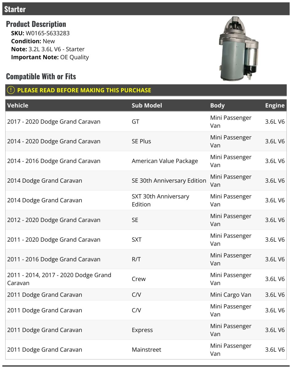 Compatible with or fits: 2017 - 2020 Dodge Grand Caravan GT Mini Passenger Van 3.6L V6 2014 - 2020 Dodge Grand Caravan SE Plus Mini Passenger Van 3.6L V6 2014 - 2016 Dodge Grand Caravan American Value Package Mini Passenger Van 3.6L V6. Compatible with or fits: 2014 Dodge Grand Caravan SE 30th Anniversary Edition Mini Passenger Van 3.6L V6 2014 Dodge Grand Caravan SXT 30th Anniversary Edition Mini Passenger Van 3.6L V6 2012 - 2020 Dodge Grand Caravan SE Mini Passenger Van 3.6L V6. Compatible with or fits: 2011 - 2020 Dodge Grand Caravan SXT Mini Passenger Van 3.6L V6 2011 - 2016 Dodge Grand Caravan R/T Mini Passenger Van 3.6L V6 2011 - 2014, 2017 - 2020 Dodge Grand Caravan Crew Mini Passenger Van 3.6L V6. Compatible with or fits: 2011 Dodge Grand Caravan C/V Mini Cargo Van 3.6L V6 2011 Dodge Grand Caravan C/V Mini Passenger Van 3.6L V6. Compatible with or fits: 2011 Dodge Grand Caravan Express Mini Passenger Van 3.6L V6 2011 Dodge Grand Caravan Mainstreet Mini Passenger Van 3.6L V6.Other fine products