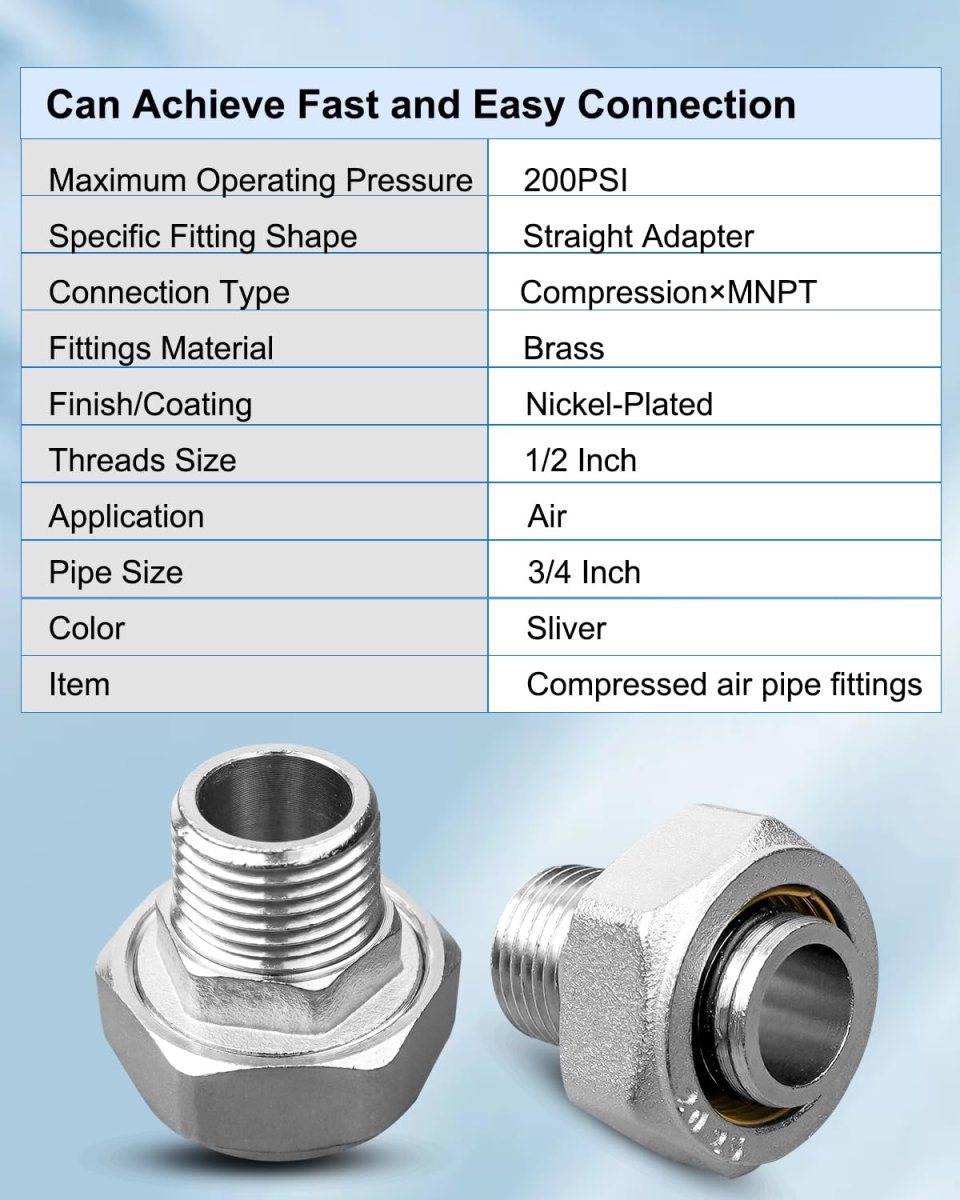 Sealing Performance: 3/4 inch straight air piping fittings adopt double o-ring design, which has good sealing performance, can effectively prevent air leakage and ensure smooth air circulation. High-quality Materials: Made of high-quality nickel-plated brass, it is resistant to high temperature, corrosion and aging, ensuring good stability and reliability during long-term use, effectively extending the service life. Usage Scenario: Fit for workshop compressed air pipeline system. Withstand High-pressure Work: Air line fittings can withstand 200PSI working pressure, and can still maintain good air tightness under high-pressure environment, reducing the risk of leakage. Easy to Install: Installation process of straight air duct fittings is simple, and installation and disassembly can be achieved without complex professional technology, making daily inspection and maintenance more convenient.Other fine products
