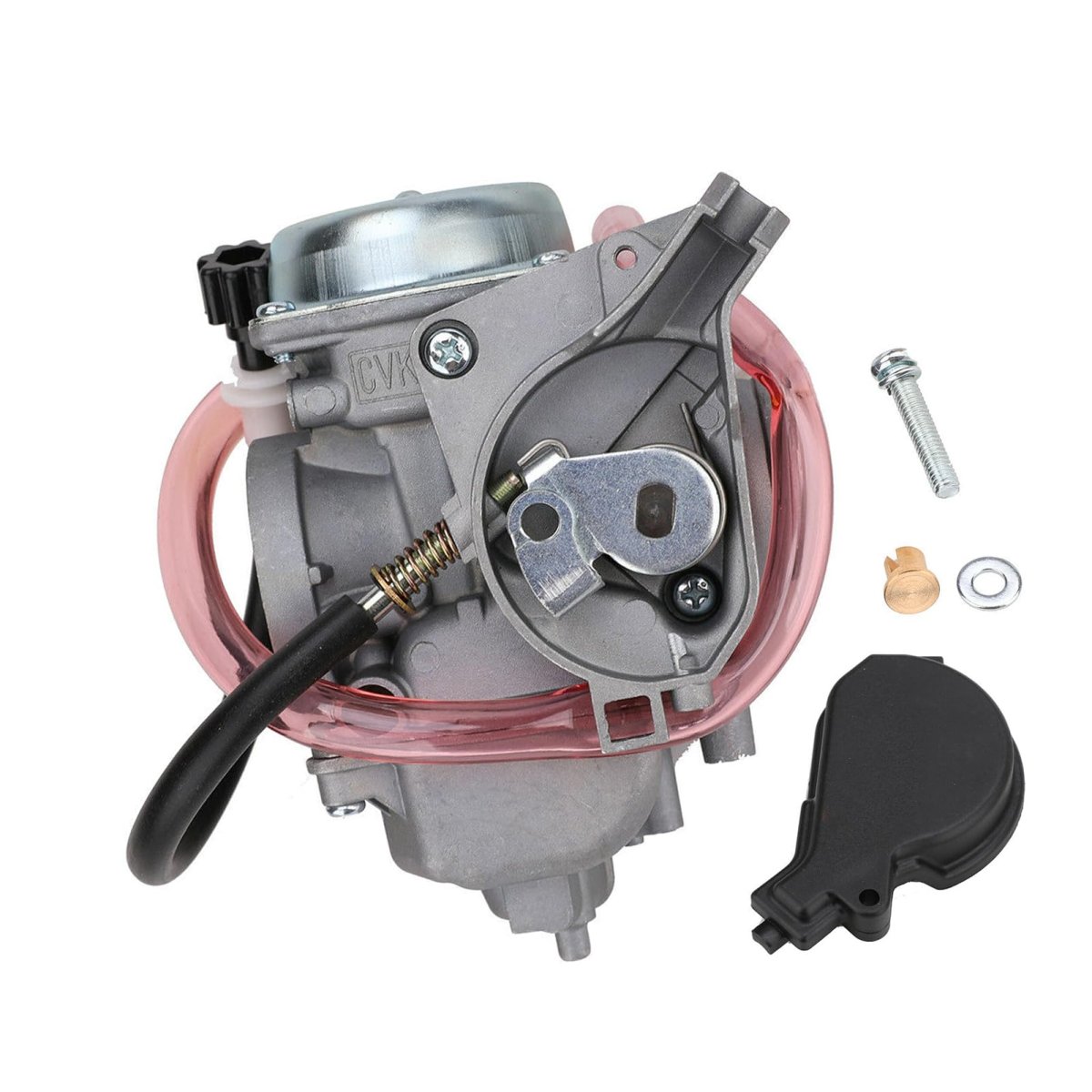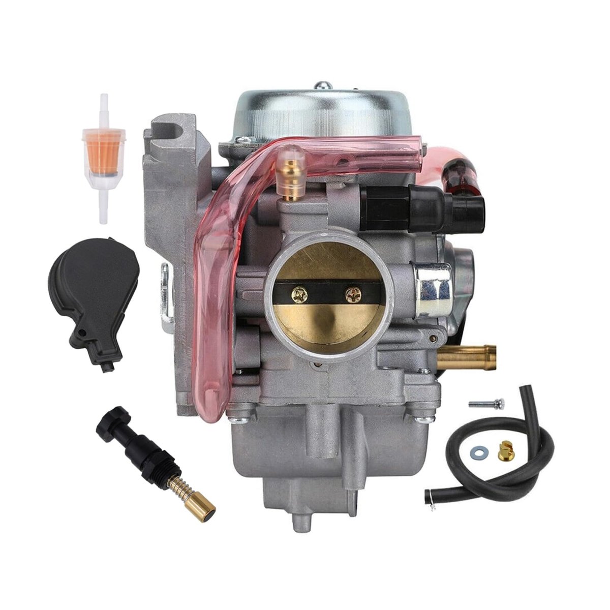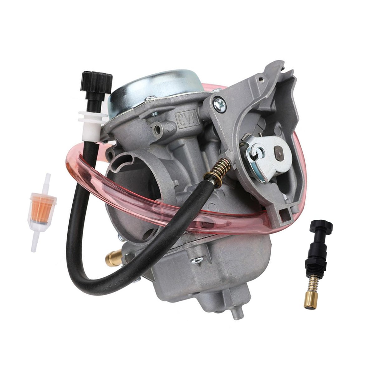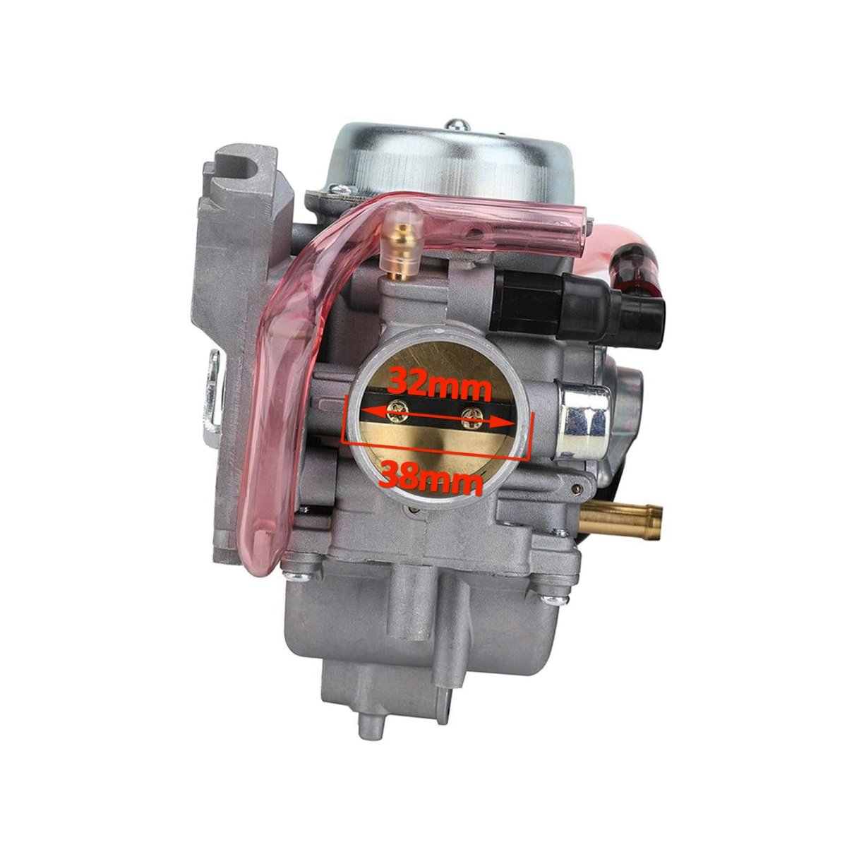[FITMENT]: For Suzuki 2002-2007 Eiger 400 LTA400 2x4 Auto ATV.. [FITMENT]: For Suzuki 2002-2007 Eiger 400 LTF400 LTF400F 2x4 4x4 Manual.. [REPLACE]: 13200-38F00, 13200-38F22, 13200-38F3V, 13200-38FA0, 13200-38FB1. [INSTALLATION]: Complete & preset, bolt it on directly and it starts right up.. [SIZES]: Intake side inner 32mm & outer 38mm, air filter side 47mm & 50mm. [PACKAGE]: 1 Carburetor (main jet 138/pilot jet 40), 1 fuel filter, 1 choke plunger valve.