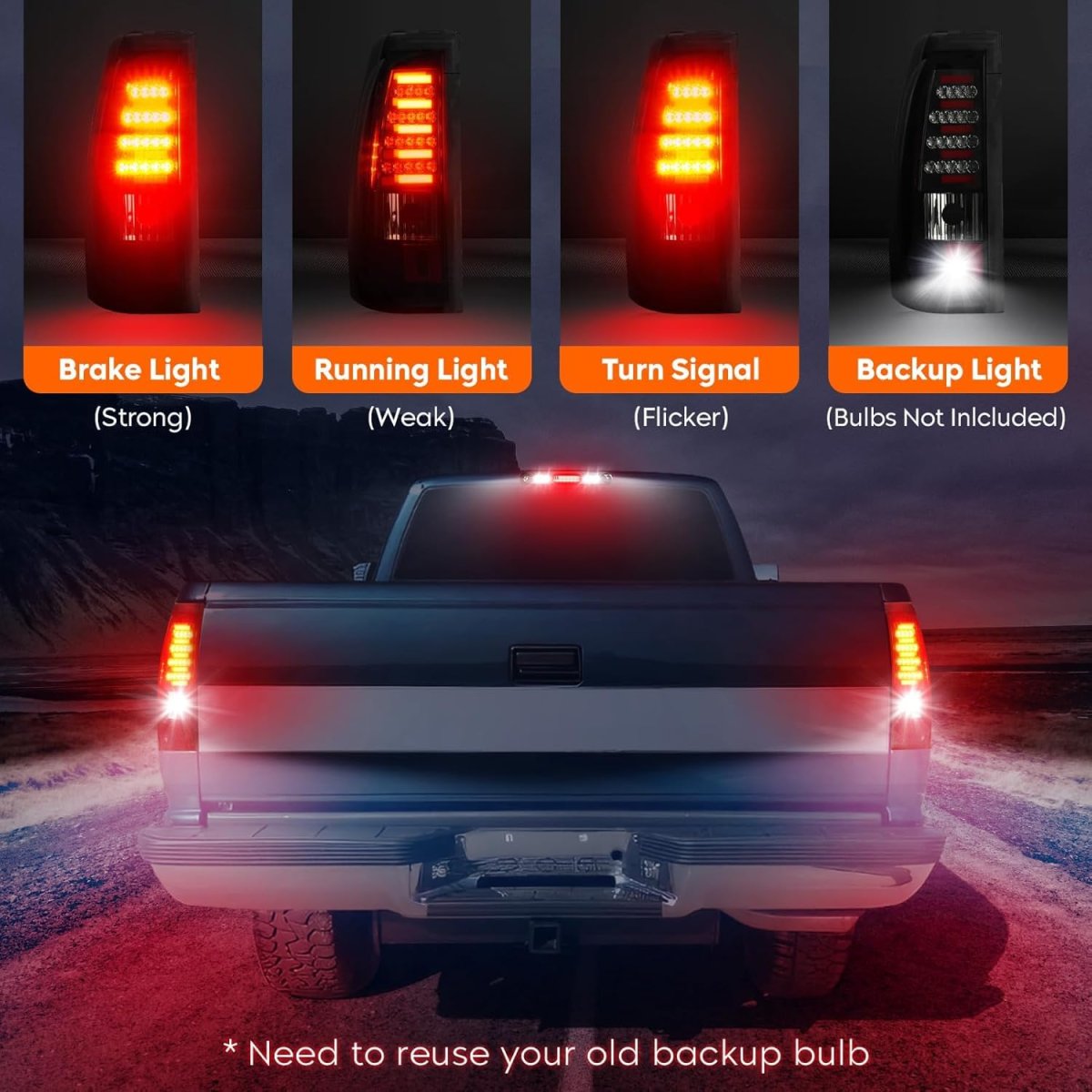 Fitment for Chevy Silverado 1500 & 2500 2003-2006, for Silverado 1500 Classic & 1500 2500 HD Classic 2007, for Silverado 3500 2004-2006; for GMC Sierra 1500 & 1500 HD & 2500 & 2500 HD & 3500 2004-2006, for Sierra 1500 3500 Classic & 1500 2500 HD Classic 2007 (Only Fits Fleetside Bed, Not Fit Stepside Beds). All-in-one Taillight LED running light, brake light, turn signal light, reverse light (backup light) (you need to reuse your old backup bulb). All-in-one Brake Light Brake light + Cargo light function. Durable Construction Heavy-duty housings are made of superior ABS plastic to ensure exceptional weather and impact resistance. Strict Quality Control Tresound lights are always manufactured to meet specifications. During each step of production, multiple quality control checks are performed to ensure each and every part lasts for years to come.