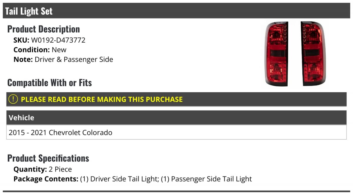 - Tail Light Assembly Set Of 2 Compatible With 2015-2021 Chevy Colorado