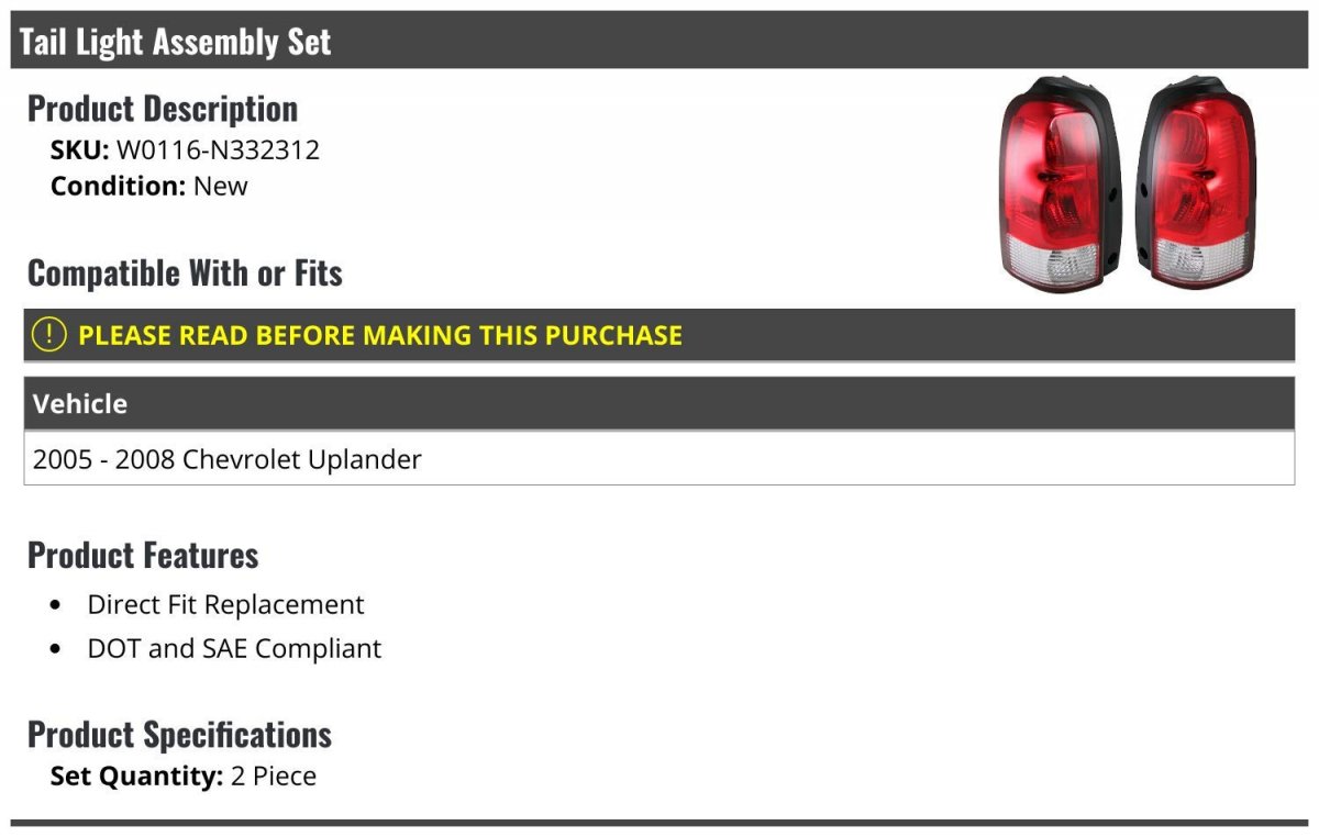 - Tail Light Assembly Set Of 2 For 2005-2008 Chevy Uplander