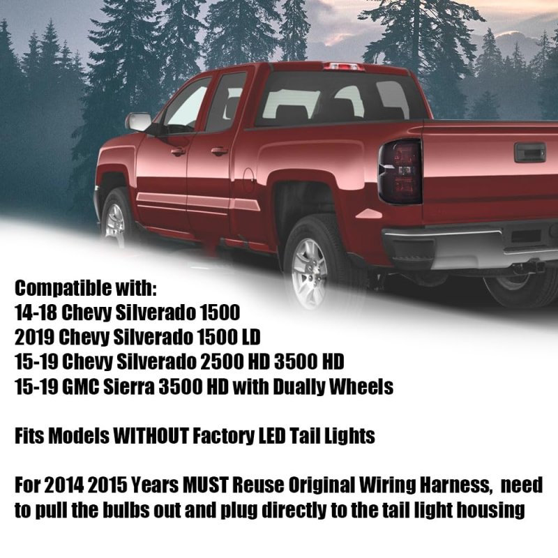Vehicle Compatibility - Tail lights compatible with Chevy Silverado 1500 2014-2018, Chevy Silverado 1500 Limited 2019, Chevy Silverado 2500HD 3500HD 2015-2019, GMC Sierra 3500HD with dually wheels 2015-2019, fits model WITHOUT factory LED tail lights. Attention: For 2014 to 2015 Models Years MUST Reuse Original Wiring Harness, you just need to pull the bulbs out and plug directly to the tail light housing.. OE Standard - GM2800293,GM2801293,23295939,84288723,84019503,23295938,84288722. Durable & Corrosion resistant - Made of durable material PMMA Lens,ABS Housing and the one-piece impact resistant housing ensures reliable vibration resistance, UV protection and rain corrosion resistance.. Weatherproof Construction - Silicone sealed and equipped with one-way vents to prevent moisture from entering the interior.. Easy to Install - Direct Bolt-on OE Fitment or Replacement for the Stock Unit,Comes with a Complete Set of Tail Lights (Driver and Passenger Side).Other fine products