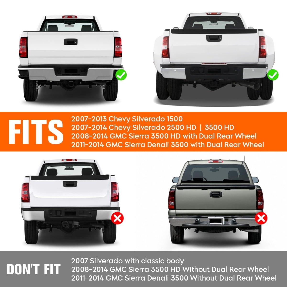 Compatible with for Chevy Silverado 1500 2007-2013, for Chevy Silverado 2500 HD 2007-2014, for Chevy Silverado 3500 HD 2007-2014, for GMC Sierra 3500 HD 2008-2014 (Dual Rear Wheel Only), for GMC Sierra Denali 3500 2011-2014 (Dual Rear Wheel Only) Do Not Fits: 2007 Chevy Silverado in Classic Model. All-in-one Taillight LED running light, brake light, turn signal light, reverse light (backup light) (you need to reuse your old backup bulb). All-in-one Brake Light Brake light + Cargo light function. Strict Quality Control Tresound lights are always manufactured to meet specifications. During each step of production, multiple quality control checks are performed to ensure each and every part lasts for years to come.. Durable Construction Heavy-duty housings are made of superior ABS plastic to ensure exceptional weather and impact resistance.Other fine products