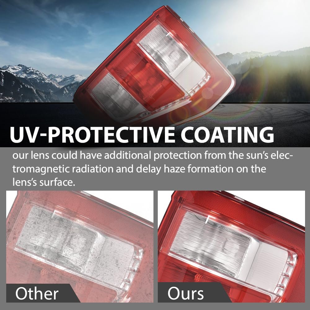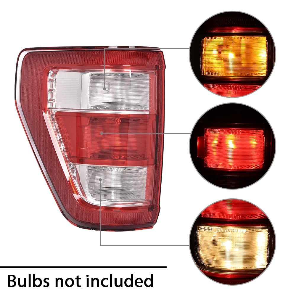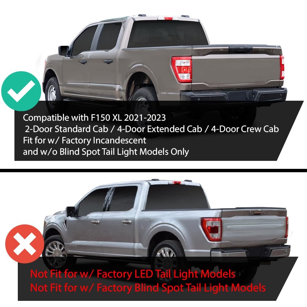 Fitment: Compatible with Ford F150 XL 2021 2022 2023 (2-Door Standard Cab 4-Door Extended Cab 4-Door Crew Cab).Fit w/ Factory Incandescent and w/o Blind Spot Tail Light Models Only.Not Fit w/ Factory LED Tail Light Models.Not Fit w/ Factory Blind Spot Tail Light Models. OE Standard: Meets the Original Equipment (OE) standards, ensuring replacement fit just like the original. Interchange part number: FO2800281, FO2818159, ML3Z13404E, ML3Z13404A, ML3Z13404A. Excellent Materials:Our tail light lens is UV resistant and shockproof.The lenses will not easily turn yellow or or crack. The impact resistant housing ensures reliable vibration resistance, UV protection and rain corrosion resistance. Enhance Visibility:Enhance rear visibility and appearance, making your vehicle more easily visible to other drivers and passengers. Easy to Install:Manufactured according to factory specifications, , easy installation. We strongly recommend professional installation..Other fine products