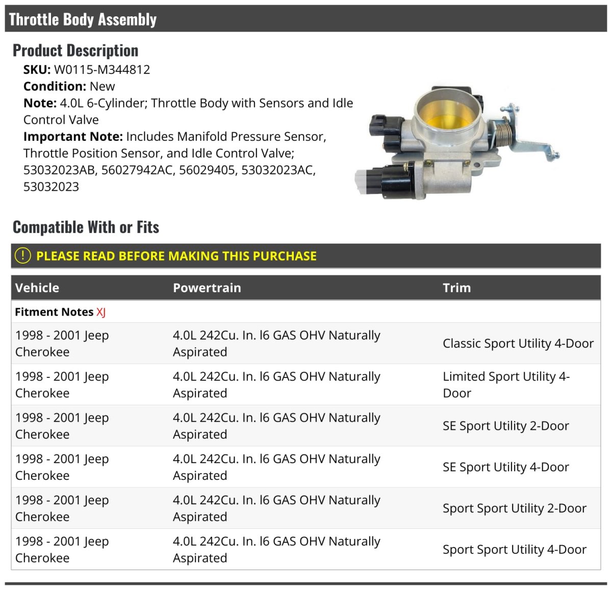 4.0L 6-Cylinder; Throttle Body with Manifold Pressure Sensor, Throttle Position Sensor, and Idle Control Valve. Compatible with or fits: Note: XJ; 1998 - 2001 Jeep Cherokee Classic Sport Utility 4-Door 4.0L 242Cu. In. l6 GAS OHV Naturally Aspirated. Compatible with or fits: Note: XJ; 1998 - 2001 Jeep Cherokee Limited Sport Utility 4-Door 4.0L 242Cu. In. l6 GAS OHV Naturally Aspirated 1998 - 2001 Jeep Cherokee SE Sport Utility 2-Door 4.0L 242Cu. In. l6 GAS OHV Naturally Aspirated. Compatible with or fits: Note: XJ; 1998 - 2001 Jeep Cherokee SE Sport Utility 4-Door 4.0L 242Cu. In. l6 GAS OHV Naturally Aspirated. Compatible with or fits: Note: XJ; 1998 - 2001 Jeep Cherokee Sport Sport Utility 2-Door 4.0L 242Cu. In. l6 GAS OHV Naturally Aspirated 1998 - 2001 Jeep Cherokee Sport Sport Utility 4-Door 4.0L 242Cu. In. l6 GAS OHV Naturally Aspirated.Other fine products