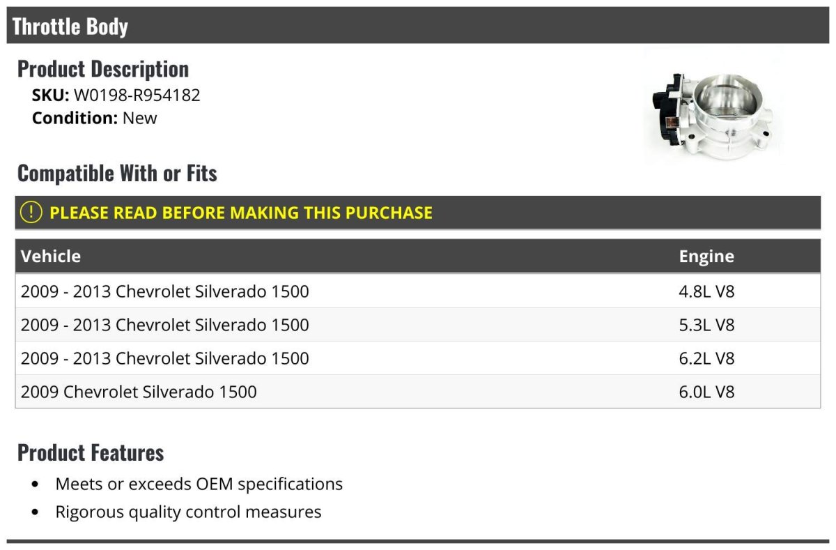 Compatible with or fits: 2009 - 2013 Chevy Silverado 1500 4.8L V8 2009 - 2013 Chevy Silverado 1500 5.3L V8 2009 - 2013 Chevy Silverado 1500 6.2L V8 2009 Chevy Silverado 1500 6.0L V8. Meets or exceeds OEM specifications. Rigorous quality control measures. Throttle Body. Review Description to Ensure Proper Fit.Other fine products