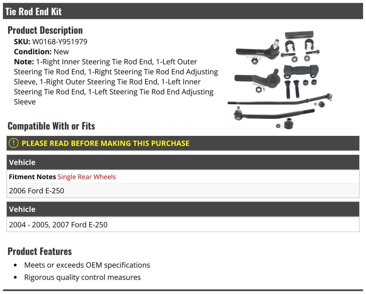 1-Right Inner Steering Tie Rod End, 1-Left Outer Steering Tie Rod End, 1-Right Steering Tie Rod End Adjusting Sleeve, 1-Right Outer Steering Tie Rod End, 1-Left Inner Steering Tie Rod End, 1-Left Steering Tie Rod End Adjusting Sleeve. Compatible with or fits: (Note: Single Rear Wheels; 2006 Ford E-250) (2004 - 2005, 2007 Ford E-250). Meets or exceeds OEM specifications. Rigorous quality control measures. Tie Rod End Kit.Other fine products