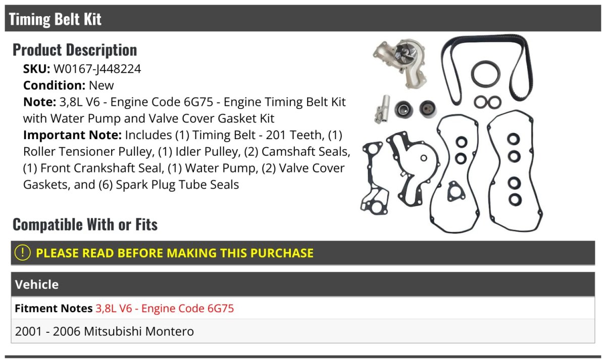 3.8L V6 - Engine Code 6G75 - Engine Timing Belt Kit with Water Pump and Valve Cover Gasket Kit. Includes: (1) Timing Belt - 201 Teeth, (1) Roller Tensioner Pulley, (1) Idler Pulley, (2) Camshaft Seals, (1) Front Crankshaft Seal, (1) Water Pump, (2) Valve Cover Gaskets, and (6) Spark Plug Tube Seals. Compatible with or fits: Note: 2001 - 2006 Mitsubishi Montero 3.8L V6 - Engine Code 6G75. Engine Timing Belt Kit with Water Pump and Valve Cover Gasket Kit. Review Description to Ensure Proper Fit.