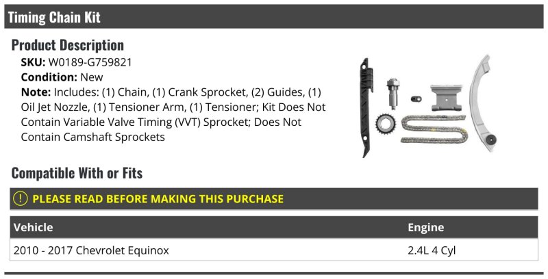 Compatible with or fits: 2010 - 2017 Chevrolet Equinox 2.4L 4 Cyl. For 2.4L 4-Cylinder Models Only. Includes: (1) Chain; (1) Crank Sprocket; (2) Guides; (1) Oil Jet Nozzle; (1) Tensioner Arm; (1) Tensioner; Kit Does Not Contain Variable Valve Timing (VVT) Sprocket; Does Not Contain Camshaft Sprockets. Original Equipment Standard. Review Description to Ensure Proper Fit.Other fine products