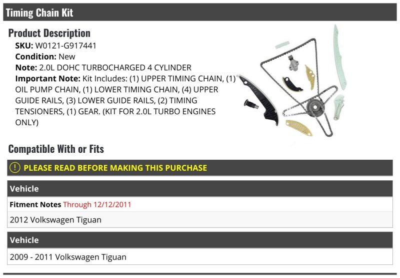 2.0L DOHC TURBOCHARGED 4 CYLINDER. Kit Includes: (1) Upper Timing Chain, (1) Oil Pump Chain, (1) Lower Timing Chain, (4) Upper Guide Rails, (3) Lower Guide Rails, (2) Timing Tensioners, (1) Gear.. Compatible with or fits: 2009 - 2012 Volkswagen Tiguan (Up To 12-12-2011). Timing Chain Kit. Review Description to Ensure Proper Fit.Other fine products