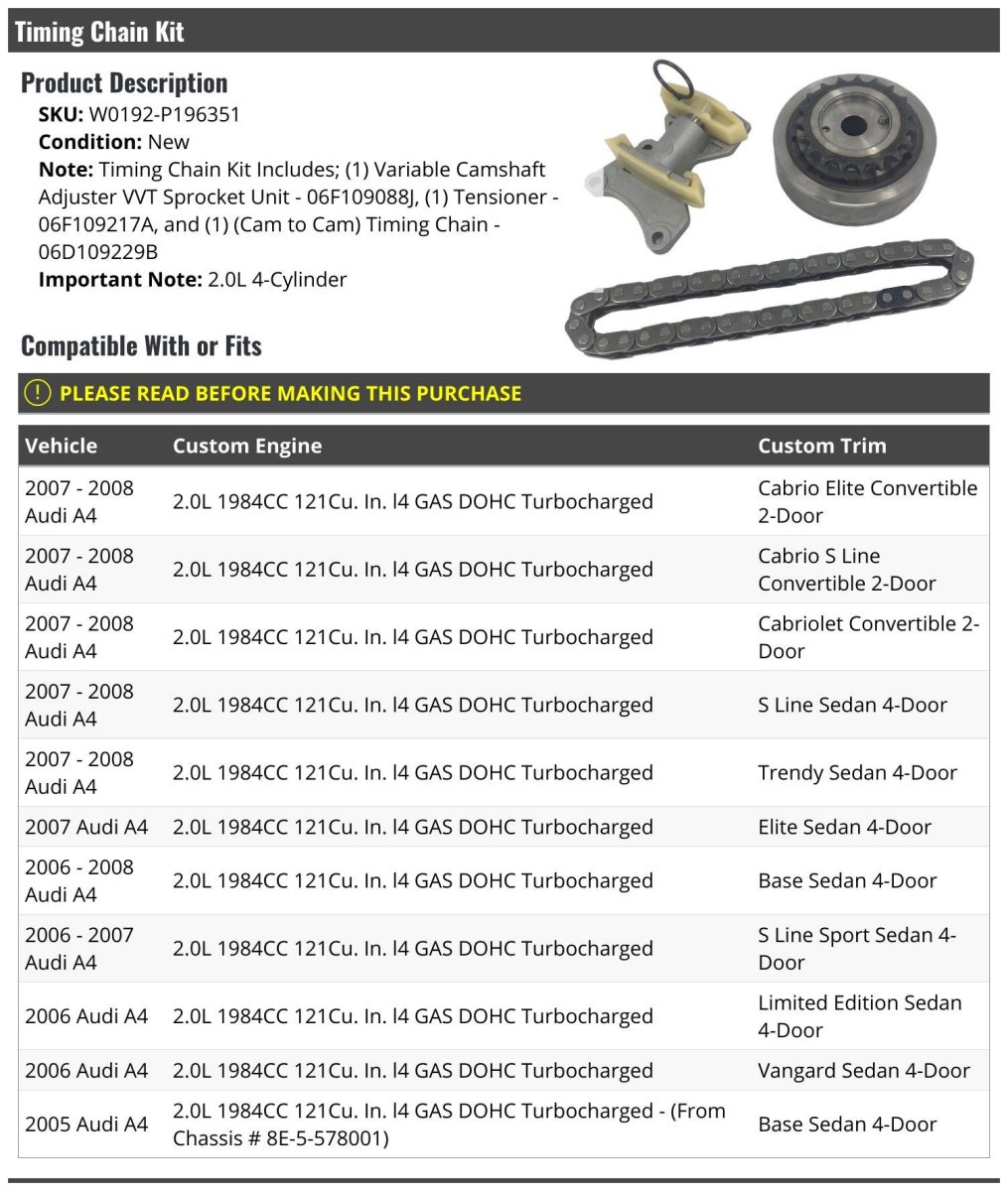 Timing Chain Kit Includes; (1) Variable Camshaft Adjuster VVT Sprocket Unit - 06F109088J, (1) Tensioner - 06F109217A, and (1) (Cam to Cam) Timing Chain - 06D109229B. 2.0L 4-Cylinder. Compatible with or fits: 2007 - 2008 Audi A4 Cabrio Elite Convertible 2-Door 2.0L 1984CC 121Cu. In. l4 GAS DOHC Turbocharged 2007 - 2008 Audi A4 Cabrio S Line Convertible 2-Door 2.0L 1984CC 121Cu. In. l4 GAS DOHC Turbocharged 2007 - 2008 Audi A4 Cabriolet Convertible 2-Door 2.0L 1984CC 121Cu. In. l4 GAS DOHC Turbocharged 2007 - 2008 Audi A4 S Line Sedan 4-Door 2.0L 1984CC 121Cu. In. l4 GAS DOHC Turbocharged. Compatible with or fits: 2007 - 2008 Audi A4 Trendy Sedan 4-Door 2.0L 1984CC 121Cu. In. l4 GAS DOHC Turbocharged 2007 Audi A4 Elite Sedan 4-Door 2.0L 1984CC 121Cu. In. l4 GAS DOHC Turbocharged 2006 - 2008 Audi A4 Base Sedan 4-Door 2.0L 1984CC 121Cu. In. l4 GAS DOHC Turbocharged 2006 - 2007 Audi A4 S Line Sport Sedan 4-Door 2.0L 1984CC 121Cu. In. l4 GAS DOHC Turbocharged 2006 Audi A4 Limited Edition Sedan 4-Door 2.0L 1984CC 121Cu. In. l4 GAS DOHC Turbocharged. Compatible with or fits: 2006 Audi A4 Vangard Sedan 4-Door 2.0L 1984CC 121Cu. In. l4 GAS DOHC Turbocharged 2005 Audi A4 Base Sedan 4-Door 2.0L 1984CC 121Cu. In. l4 GAS DOHC Turbocharged - (From Chassis # 8E-5-578001).Other fine products