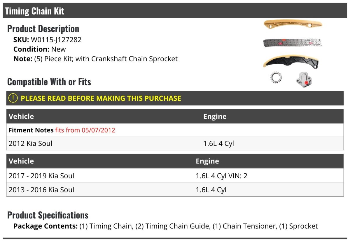 (5) Piece Kit; with Crankshaft Chain Sprocket. Compatible with or fits: 2012 Kia Soul 1.6L 4 Cyl - fits from 05/07/2012. Compatible with or fits: (2017 - 2019 Kia Soul 1.6L 4 Cyl VIN: 2 2013 - 2016 Kia Soul 1.6L 4 Cyl). Package Contents: (1) Timing Chain, (2) Timing Chain Guide, (1) Chain Tensioner, (1) Sprocket. Review Description to Ensure Proper Fit.Other fine products