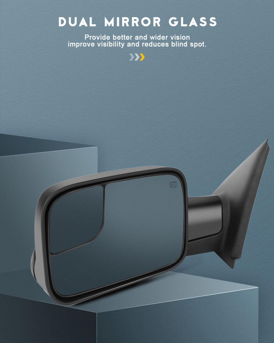 COMPATIBLE WITH: 2002-2008 for Dodge for Ram 1500 2003-2009 for Dodge for Ram 2500/3500. PERFORMANCE: Power Adjusted,Heated,No Turn Signal Light,with Black Cap Housing,Manual Folding and Flip Up. IMPROVE VISIBILITY: Our Towing Mirror Provides better and wider angle of rear view,provides more visibility when towing, prevent vibration when driving.. EASY TO INSTALL:This towing mirror is manufactured according to factory OE standards.The product is easy to installation, No drilling or cutting needed,all necessary parts are included..Other fine products