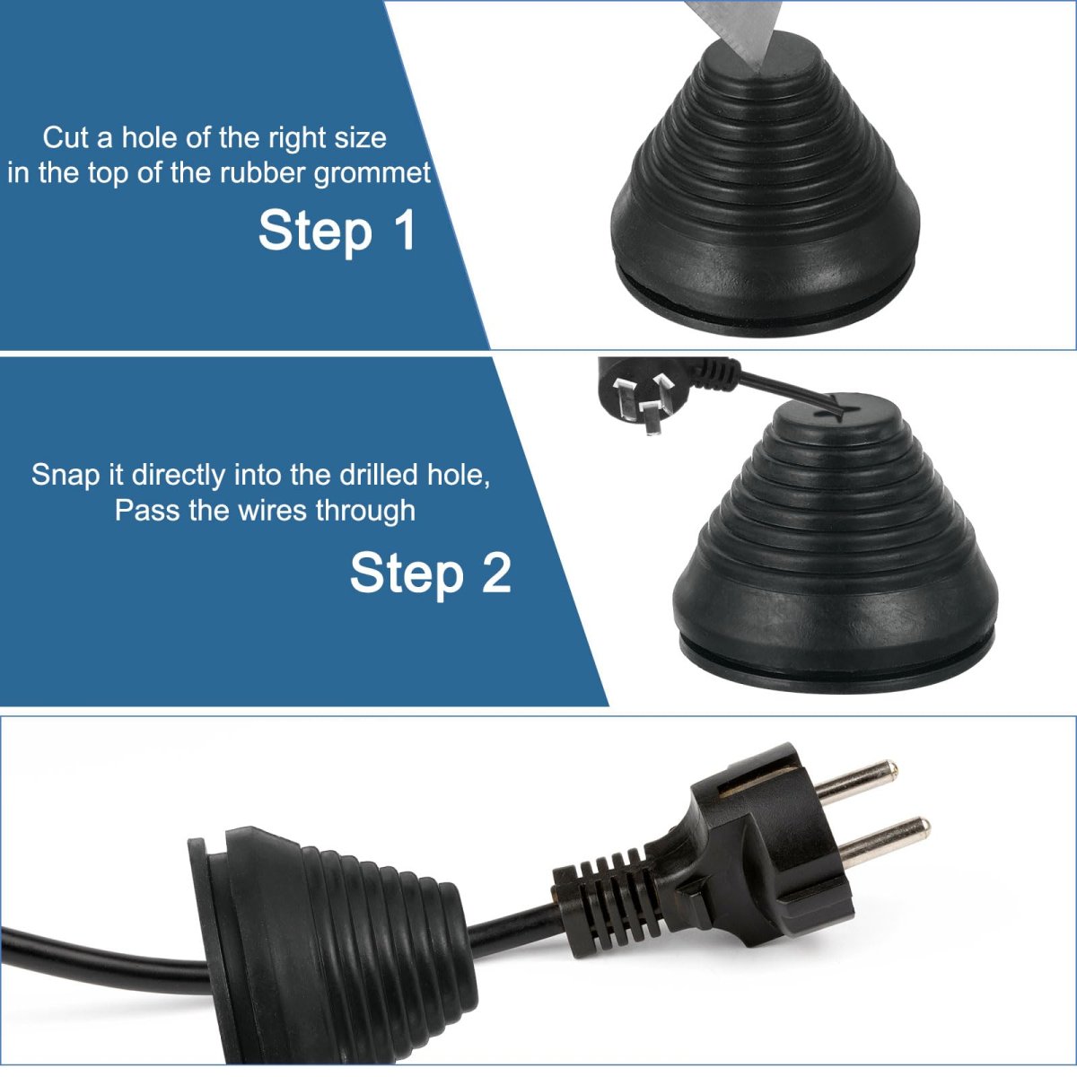 [Tower Shaped Grommet] The size of the rubber grommet is 116x110x60mm/4.57x4.33x2.36inch(OD*ID*H), you will receive 4 pcs rubber grommets, which can meet your daily needs.. [Material] Made of rubber, the surface of the desk grommet is smooth and has no burrs. It has high elasticity, is not easy to deform, has good wear resistance, good corrosion resistance, and high-temperature resistance, and can be used for a long time.. [Features] The rubber grommets can prevent wires or other materials from rubbing against metal, and the black grommets will not destroy your decoration style when used, and can blend into the desktop.. [Easy to Use] The rubber grommet is easy to use, cut a diameter of the right size in the top of the rubber plug then snap it directly into the drilled hole, and pass the wires through until the installation is finished.. [Wide Application] Firewall plug grommets are suitable for automobiles, computer desks, electrical cabinets, water pipes, chemical pipes, machinery manufacturing, etc..Other fine products