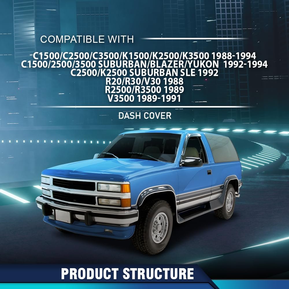 VEHICLE COMPATIBILITY: Compatible with Chevy Blazer 1992-1994; Compatible with Chevy & GMC C1500 C2500 C3500 1988-1994; Compatible with Chevy C1500/2500/3500 Suburban 1992-1994; Compatible with Chevy & GMC K1500 K2500 K3500 1988-1994; Compatible with Chevy R20/R30/V30 1988; Compatible with Chevy & GMC R2500/R3500 1989; Compatible with Chevy & GMC V3500 1989-1991; Compatible with GMC C2500/K2500 Suburban SLE 1992; Compatible with GMC Yukon 1992-1994. You can place Dash Cover on the oginial produc. RUGGED CONSTRUCTION: High-quality TPE materials are selected to ensure that the trim boards have good durability. They can withstand the test of time and daily use, not easy to lose color, deformation, delamination. Provide consumers with a long-term stable experience. EXQUISITE CRAFTSMANSHIP: Each step of the PIT66 dashboard upper trim panel is meticulously handled from cutting, sanding to assembly, ensuring that the edges of the trim panel are smooth and the splices are tight. IMPROVED APPEARANCE: The dashboard dash cover adds a good appearance to the dashboard, bringing visual appeal and refinement to the car interior. EASY INSTALLATION: Manufactured according to factory specifications. If you have no installation experience, professional installation is highly recommended.Other fine products
