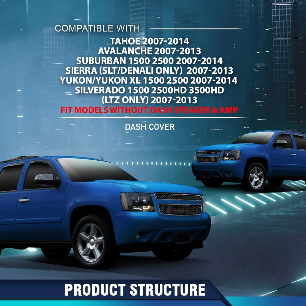 Vehicle Compatibility: Compatible with Chevy Avalanche 2007 2008 2009 2010 2011 2012 2013; Compatible with Chevy Tahoe 2007-2014; Compatible with Chevy Suburban 1500 2500 2007-2014; Compatible with Chevy Silverado 1500 2500HD 3500HD (LTZ Only) 2007-2013; Compatible with GMC Yukon/Yukon XL 1500 2500 2007-2014 ; Compatible with GMC Sierra (SLT/Denali Only) 2007-2013; Fit Models WITHOUT Dash Speaker & Amp. OE Standard: Meets the Original Equipment (OE) standards, ensuring fit just like the original. you can place it on the oginial product. Material: Made of quality TPE material with good durability and stability, not easy crack or deform and can maintain its function and appearance for a long time. Improved Appearance: The dashboard dash cover adds a good appearance to the dashboard, bringing visual appeal and refinement to the car interior. Installation: No modification required. Professional installation is highly recommended.Other fine products