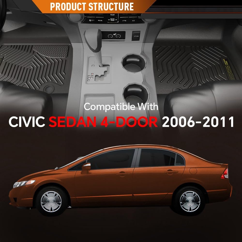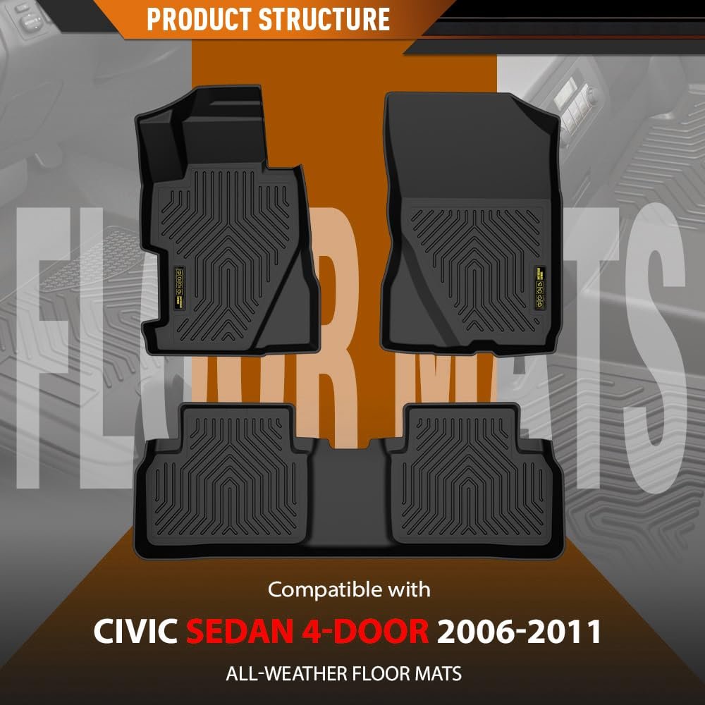 Vehicle Compatibility - Floor Mats Compatible with Honda Civic Sedan 4-Door 2006 2007 2008 2009 2010 2011. Anti-Slip - The edges of the floor mat have raised and deep grooves, which have a wider coverage. Even in humid environments, the floor mat has strong grip and will not move easily, effectively preventing the floor mat from slipping off. Outstanding Material - Floor mats made from durable TPE materials that exhibit excellent resistance to wear and scratches, ensuring long-lasting aesthetics. All-Weather Protection Raised edges all the way around have been upgraded to shield your floor from dirt, mud, salt, rain, snow and even hot summer temperatures. Keep your car floor as good as new all the time. Easy To Use & Maintain - When first used, leave the foot mats in the sun for a day or fold them in the opposite direction several times to restore their shape and make them fit the vehicle better. To clean, simply remove the mat and rinse with water or wipe with a rag to restore cleanliness.Other fine products