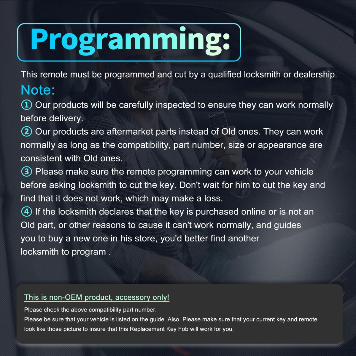 Specification: FCC ID: TQ8-FOB-4F11, OE Number:95440-D3510, Frequency: 433 MHz, Buttons: 4 Buttons.. Fitment: Key fob for Hyundai Tucson 2018 2019 2020 2021.. Notice Key Programming: This remote and door key must be programmed and cut by a qualified locksmith or dealership(consult some different locksmiths before programming to ensure it is successful).NOTE a working key fob was needed in order to add a new key. This remote must be programmed and cut by a qualified locksmith or dealership. Package for car key fob: 1 x Car Keyless Entry Remote (Battery Included)..Other fine products