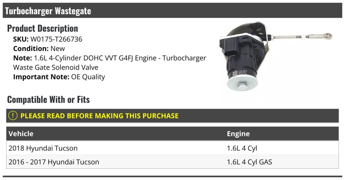 - Turbocharger Wastegate Solenoid Valve For 2016-2018 Hyundai Tucson 1 6l 4-cylinder Dohc Vvt With G4fj Engine