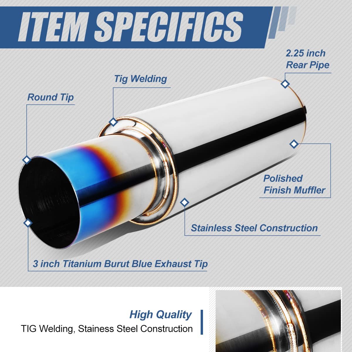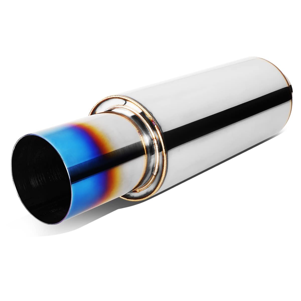 Product Description - Exhaust muffler can maximize to enhance the high exhaust air flow rate, as the important part of exhaust system.. Brilliant Performance - Come with [1] polished finish muffler with perforated core with fiberglass insulation, can get more air into your engine and more exhaust out.. Product Specification - Overall Dimensions: 14.5" Muffler Diameter : 4" OD Muffler Canister Length : 9.2" Muffler Exhaust Tip: 3" OD Tip Length : 3.5" Inlet: 2.25" OD Muffler Tip Type: Round Burnt Lip 16-Gauge Wall Thickness.