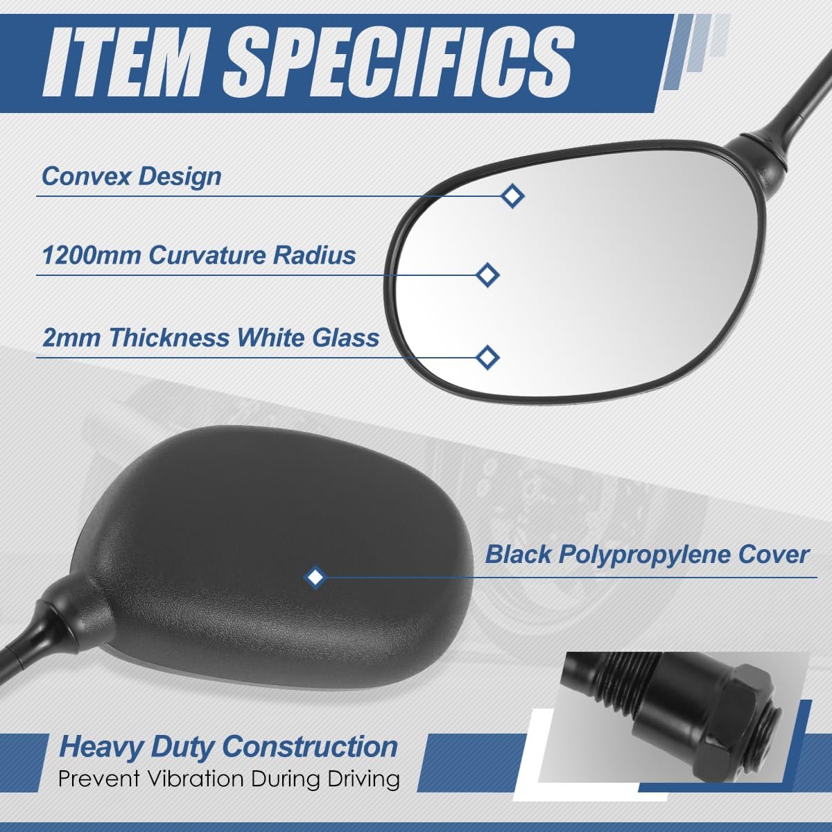 Product Description - These ATV rear side view mirros are designed to directly replace the old or damaged one for refresh appearance of vehicle with a visually striking presence at a fraction of the cost of a dealer part, can be installed just as the originals do. Brilliant Performance - Come with set of [2] heavy duty construction ATV rear view mirrors for preventing vibration during driving, make it easier to monitor the rear side view for your trailer or camper.. Easy and Quick to Install - Direct replacement for original part, can be installed quickly and easily via included adapter nuts without any modification.. Product Specifics - Curvature Radius: 1200mm Glass Thickness: 2mm Convex Design Oval Style.Other fine products