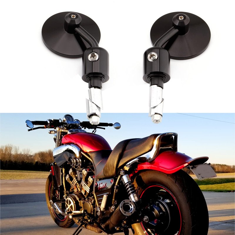Mirror body : 6061 CNC Machined Aluminum with BLACK Finish. Convex Mirror for Wider Viewing Angle,Adjustable mirror angle, up and down, left and right. Mirror Diameter: 3" (7cm). Package:1 Sets (Left & Right) rearview mirrors,Comes with 7/8" Bar end insert bushing. Will fit all Motorcycle, Street bikes, Sports bikes, Chopper, Cruiser with 7/8" Standard Handlebars.Other fine products