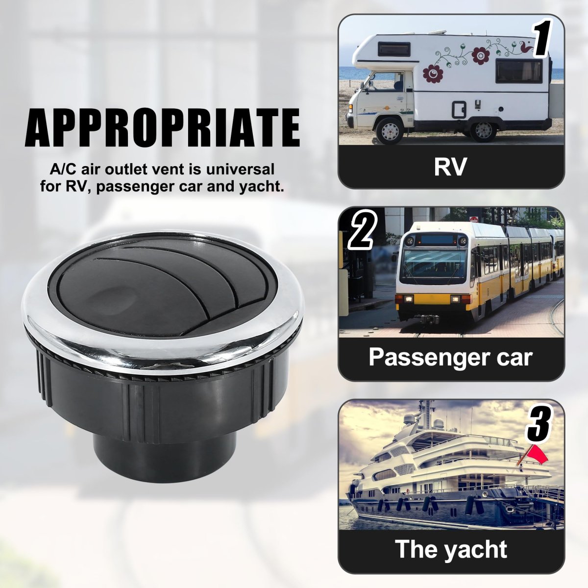 Material: ABS; Color: Black, Silver Tone. Size: Outer Diameter: 87mm/3.43"; Opening Hole Diameter: 75mm/2.95"; Air Outlet Diameter: 64mm/2.52"; Thread Height: 22mm/0.87"; Height: 50mm/1.97"; Installation Port Diameter: 46mm/1.81".. A/C air outlet vent is universal for RV, bus and yacht.. The air conditioning vent is very easy to clean,it only needs to be wiped with a wet duster cloth.. Package Included: 1 x Air Conditioning Vent.Other fine products