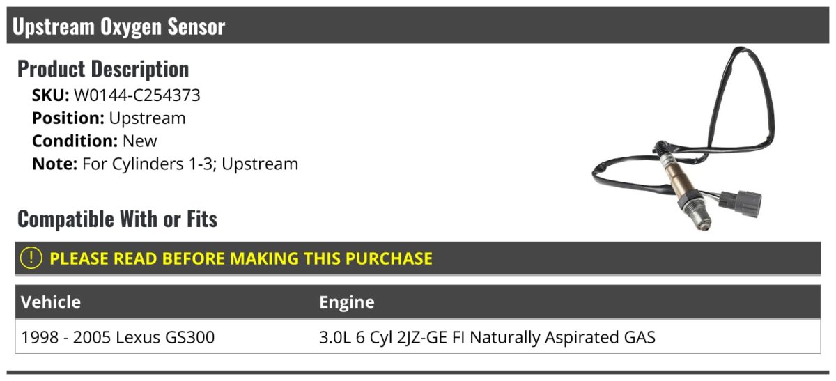 - Upstream Oxygen Sensor Cylinders 1-3 For 1998-2005 Gs300 3 0l 6-cylinder 2jz-ge Fi Naturally Aspirated Gas Fits Only