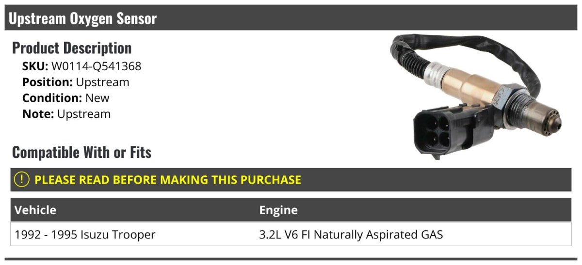 - Upstream Oxygen Sensor For 1992-1995 Isuzu Trooper 3 2l V6 Fi Naturally Aspirated Gas