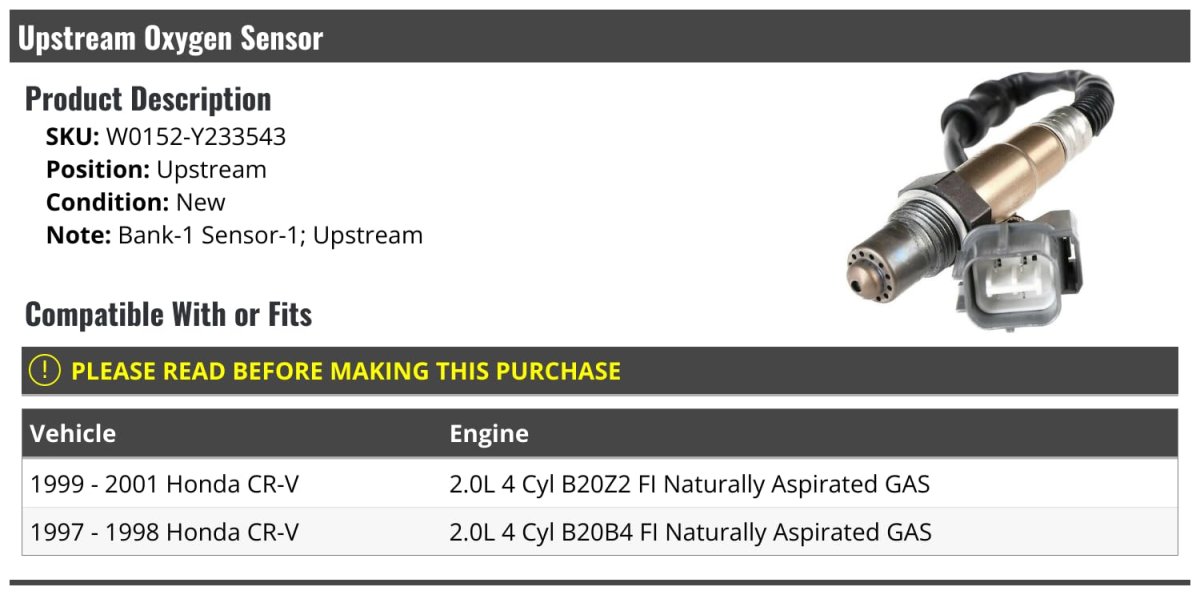 Bank-1 Sensor-1; Upstream. Compatible with or fits: 1999 - 2001 Honda CR-V 2.0L 4 Cyl B20Z2 FI Naturally Aspirated GAS. Compatible with or fits: 1997 - 1998 Honda CR-V 2.0L 4 Cyl B20B4 FI Naturally Aspirated GAS. For 2.0L 4-Cylinder Gas Only. Review Description to Ensure Proper Fit.Other fine products
