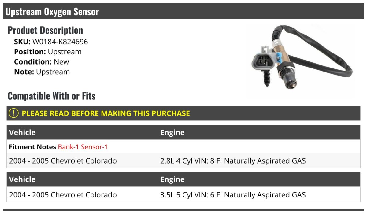 Compatible with or fits: (Note: Bank: 1; Sensor: 1) 2004 - 2005 Chevrolet Colorado 2.8L 4 Cyl VIN: 8 FI Naturally Aspirated Gas. Compatible with or fits: 2004 - 2005 Chevrolet Colorado 3.5L 5 Cyl VIN: 6 FI Naturally Aspirated Gas. Upstream Oxygen Sensor. Direct Fit. Review Description to Ensure Proper Fit.Other fine products