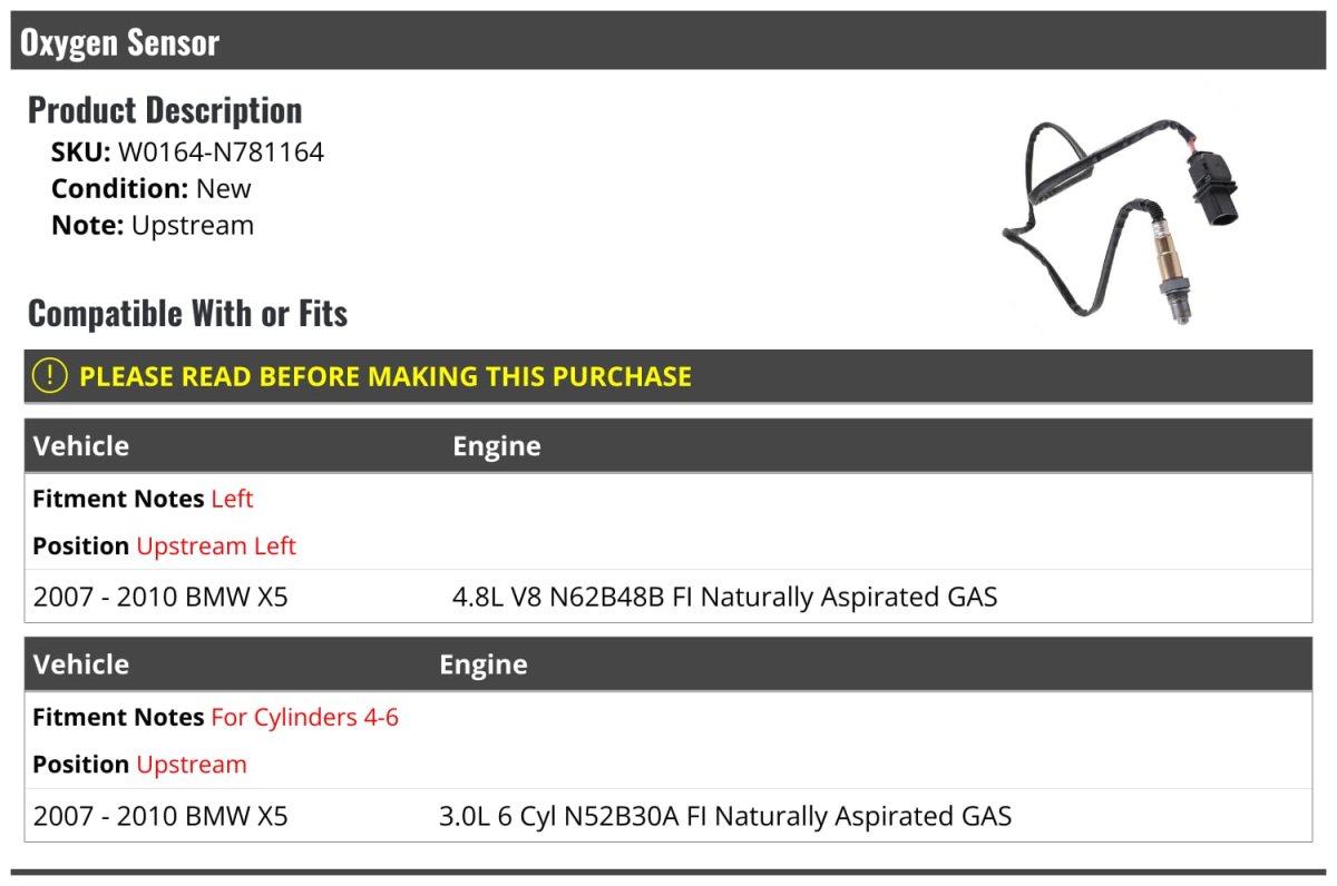 Compatible with or fits: (Note: Left; Position: Upstream) 2007 - 2010 BMW X5 4.8L V8 N62B48B FI Naturally Aspirated Gas. Compatible with or fits: (Note: For Cylinders 4-6; Position: Upstream) 2007 - 2010 BMW X5 3.0L 6 Cyl N52B30A FI Naturally Aspirated Gas. Upstream. Oxygen Sensor. Review Description to Ensure Proper Fit.