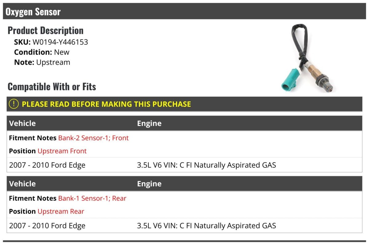 Compatible with or fits: (Note: Bank-2 Sensor-1; Front; Position: Upstream Front) 2007 - 2010 Ford Edge 3.5L V6 VIN: C FI Naturally Aspirated Gas. Compatible with or fits: (Note: Bank-1 Sensor-1; Rear; Position: Upstream Rear) 2007 - 2010 Ford Edge 3.5L V6 VIN: C FI Naturally Aspirated Gas. Upstream. Review Description to Ensure Proper Fit. OE Quality.Other fine products