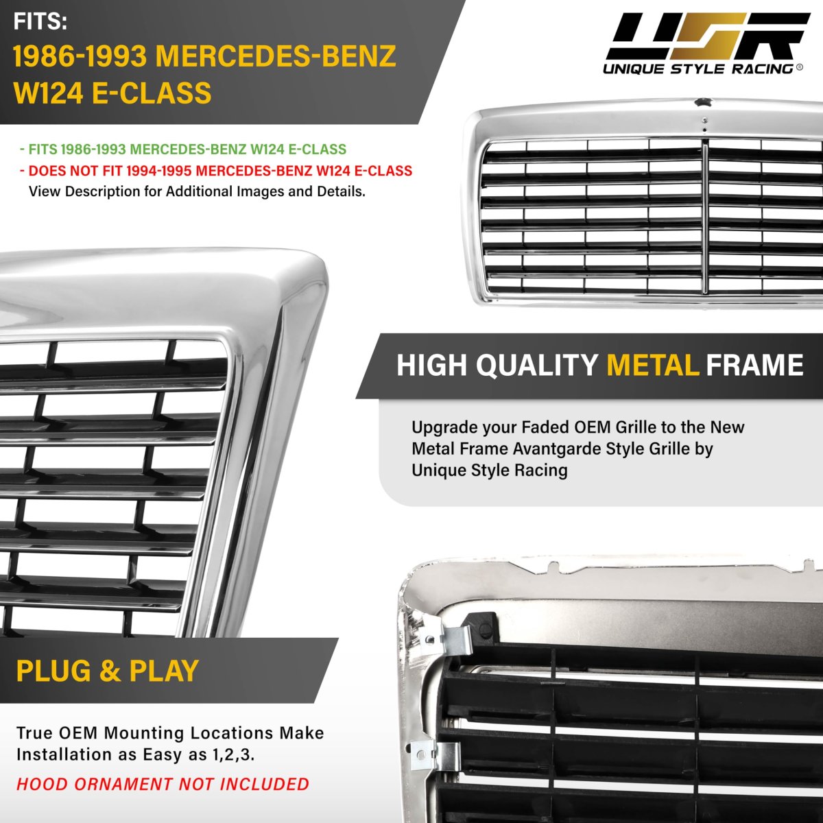 - Usr 86-93 W124 Euro Amg Look Front Hood Grill For 1986-1993 Mercedes-benz E Class E-class Black And Chrome Avantgarde Modern